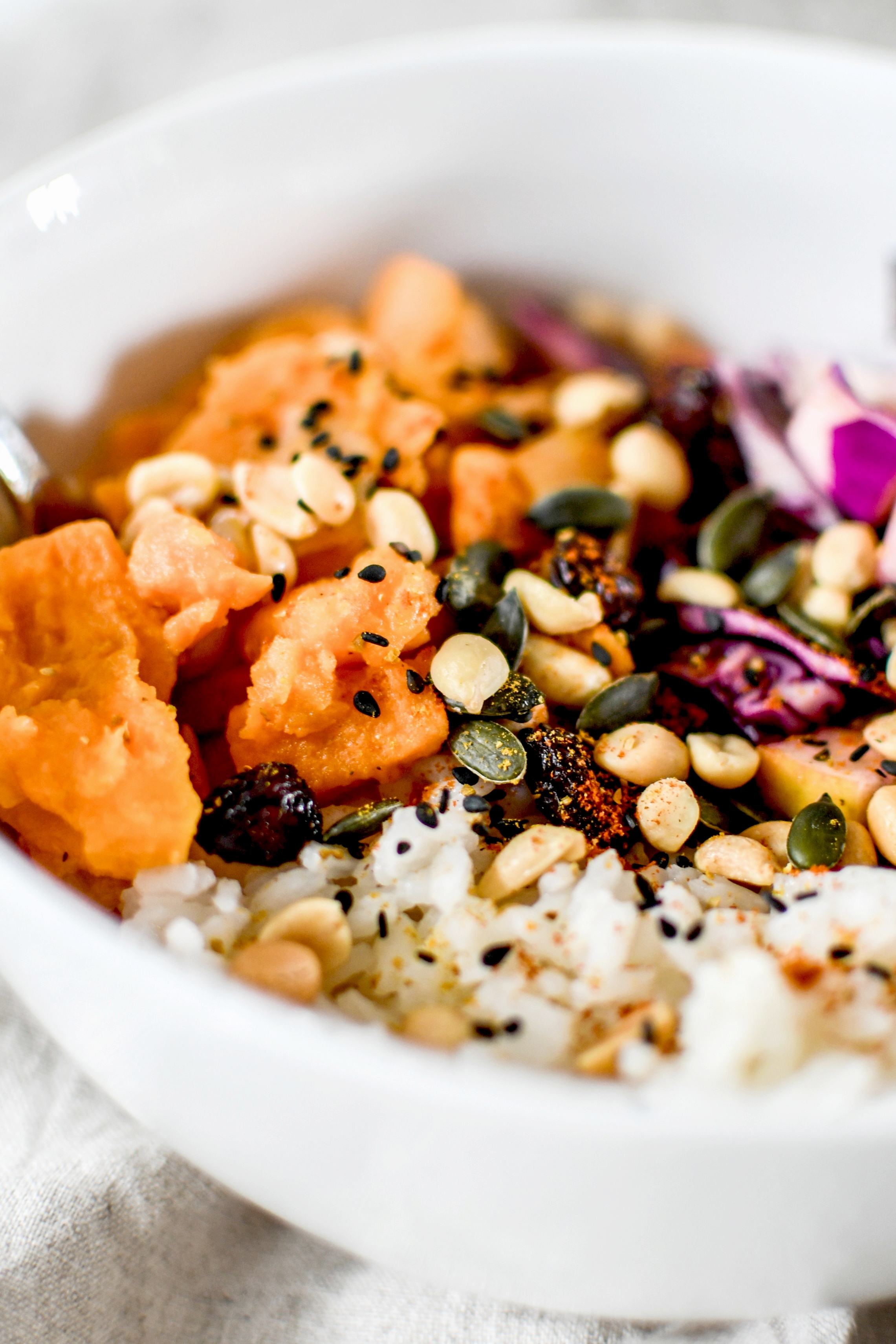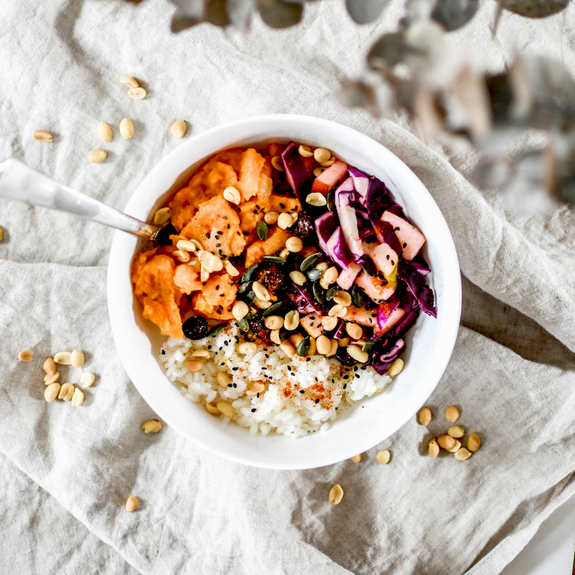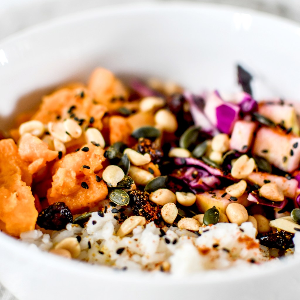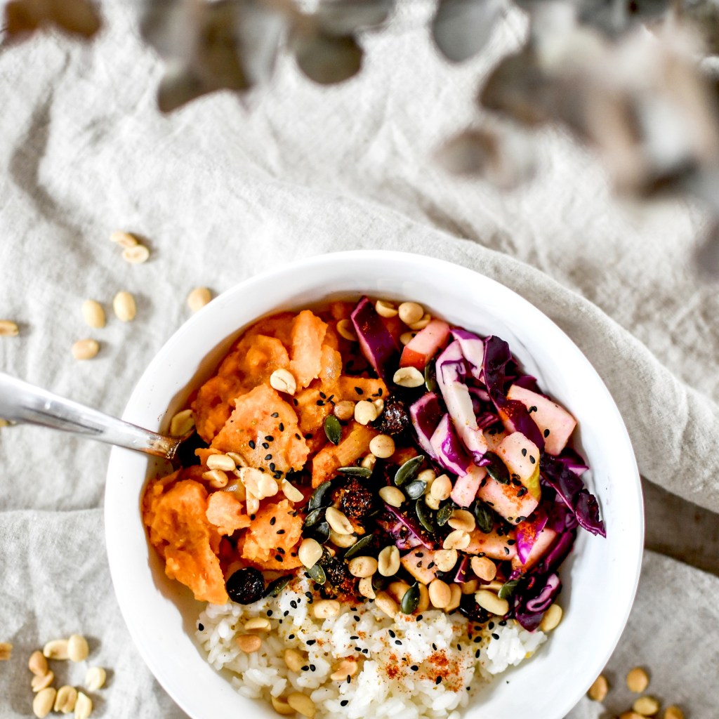 Dans un bol, juxtaposer le riz, les patates douces et la salade chou-pommes. Parsemer de graines et de cacahuètes.
