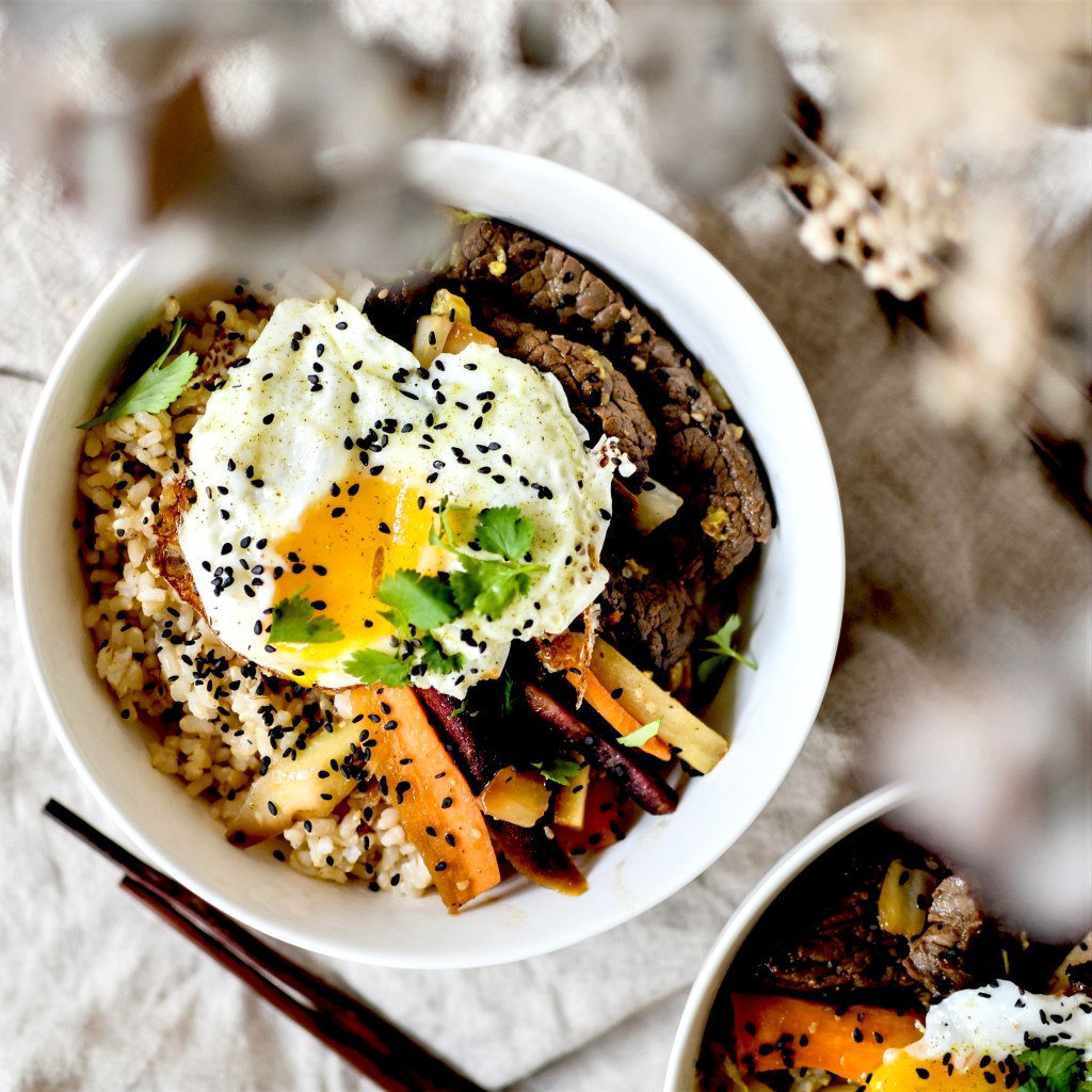 Le Bibimbap est un plat traditionnel coréen à base de riz, de viande, de légumes et d’oeuf frit. Légèrement sucré-salé, le mélange est à la fois puissant, doux et rassasiant. C’est un plat que j’avais découvert chez Douri, un petit restaurant coréen de Strasbourg, bien caché et que peu de gens connaissent, où j’allais très souvent lorsque j’étais étudiante. L’accueil y était toujours chaleureux et les plats exceptionnellement généreux. Bref, des années que j’avais envie de reproduire ce plat et la saison s’y prête très bien car on y trouve tous les légumes nécessaires.