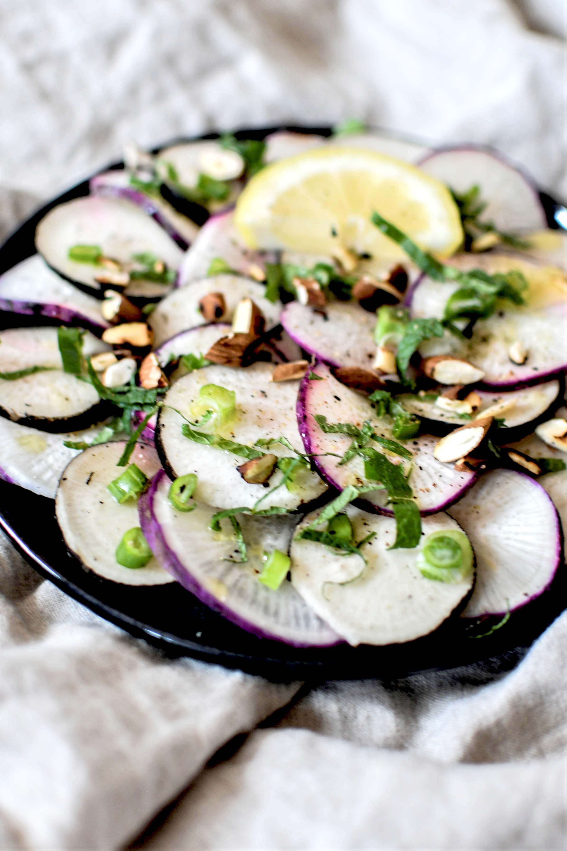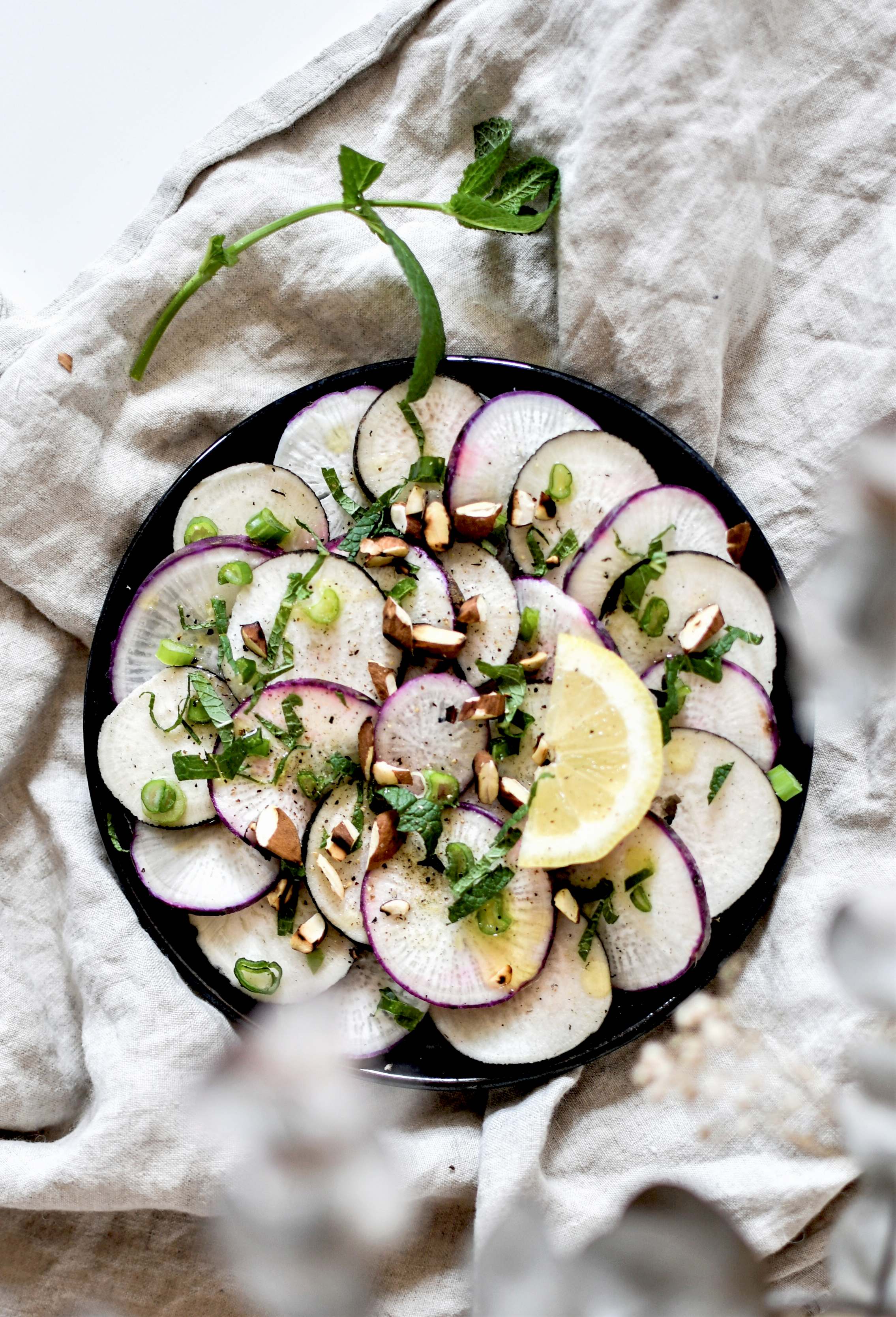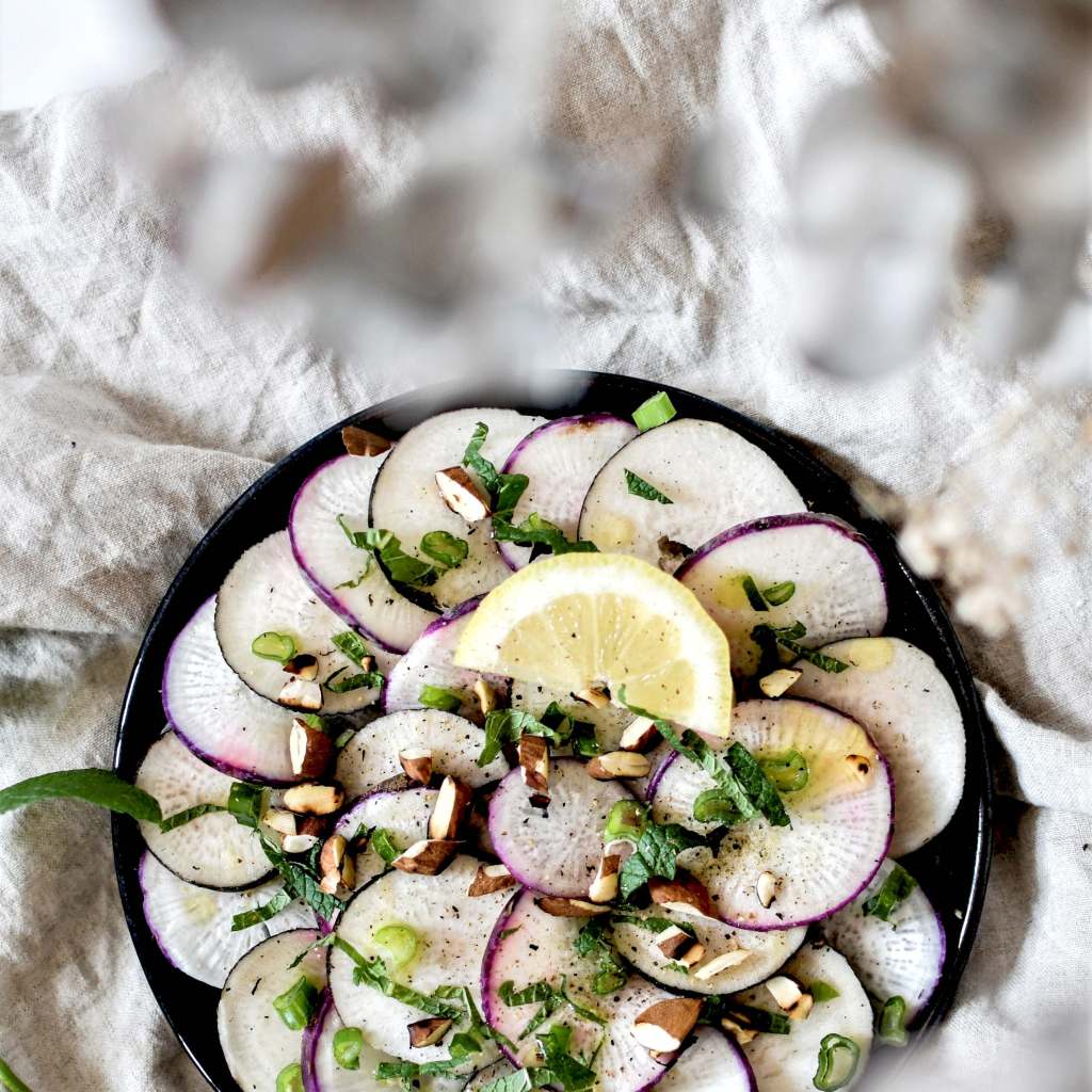 Vous avez en effet été nombreux.ses à me suggérer de réaliser un carpaccio de radis noir, une recette qui me faisait d’ailleurs de l’œil depuis longtemps (j’en parlais même sur France Bleu il y a quelques semaines).