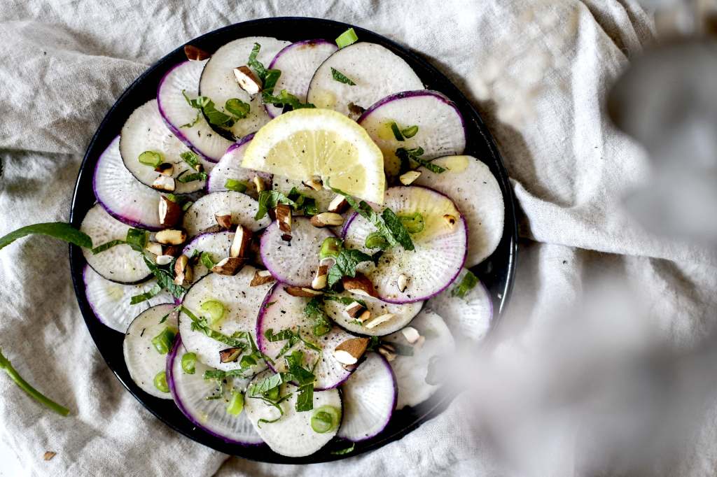 Dans un plat, déposer les lamelles de radis. Hacher finement l’oignon nouveau et la menthe. Répartir sur le dessus. Arroser du jus du citron et d’un filet d’huile d’olive. Parsemer enfin de noisette torréfiées, saler et poivrer.