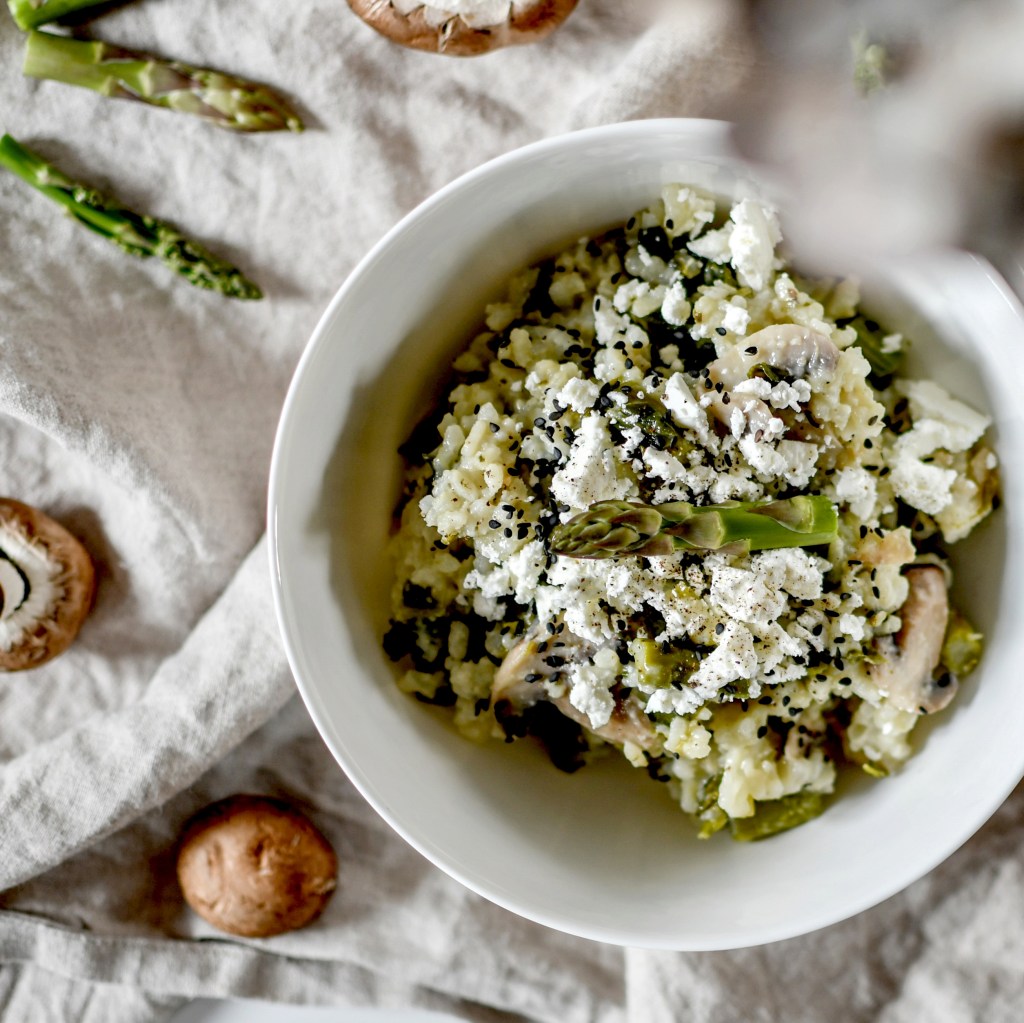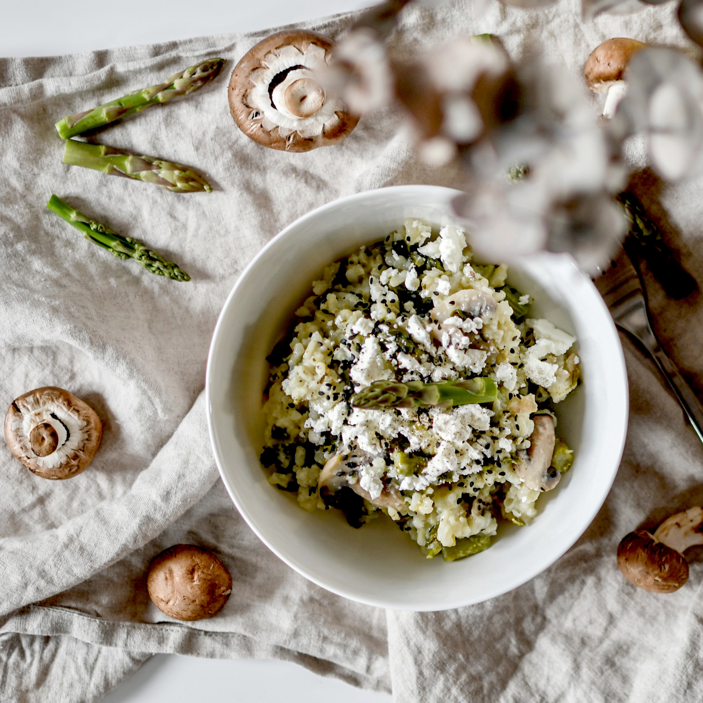 J’ai mis presque autant de légumes verts (mes préférés vous le savez) que de riz dans cette recette. Je me demandais ce que ça donnerait mais le résultat est plus que parfait. Elle en est d’autant plus saine, digeste et incroyablement onctueuse. Le jus des légumes apporte tout le goût et la texture au risotto.