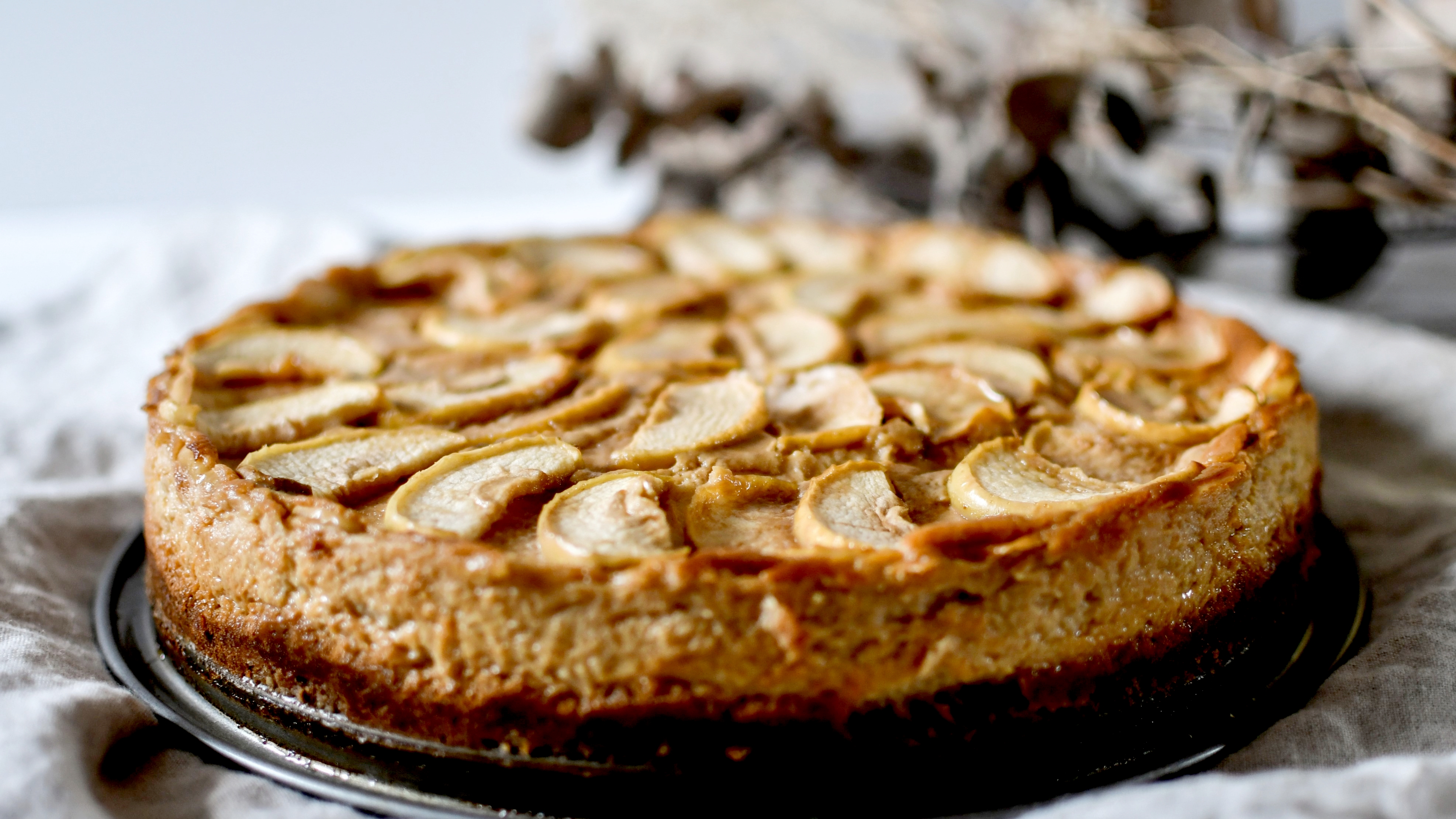 Les pommes apportent de la beauté, un peu d’acidité et surtout de la gourmandise. Leur jus s’écoule dans le cheesecake et parfume le tout pendant la cuisson. Pour le sucre, j’ai utilisé du sucre complet rapadura, je l’aime beaucoup parce qu’il apporte un petit goût caramélisé. Ca joue beaucoup aussi sur l’aspect puisque ça donne cette jolie couleur caramel à l’ensemble du gâteau.