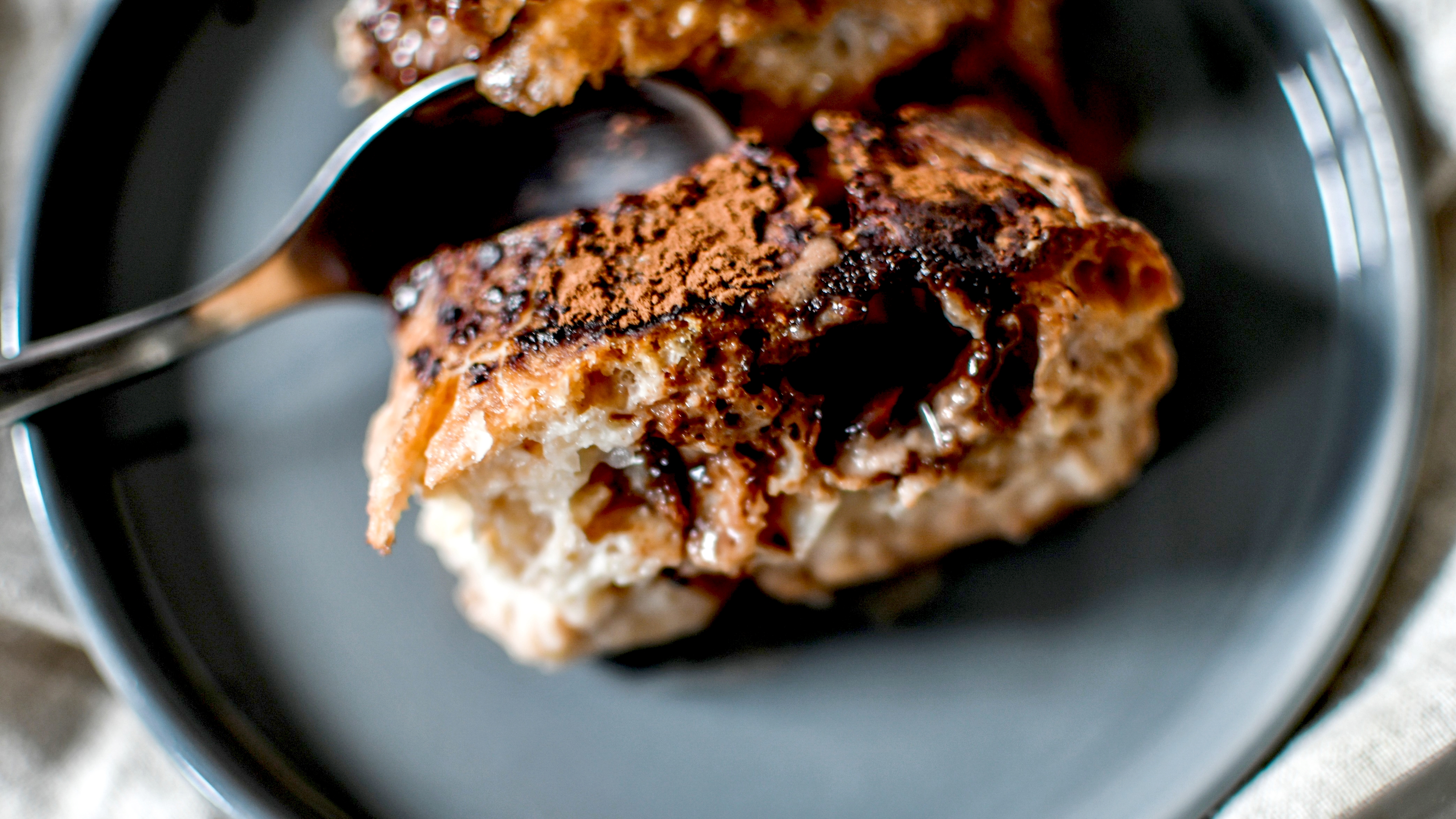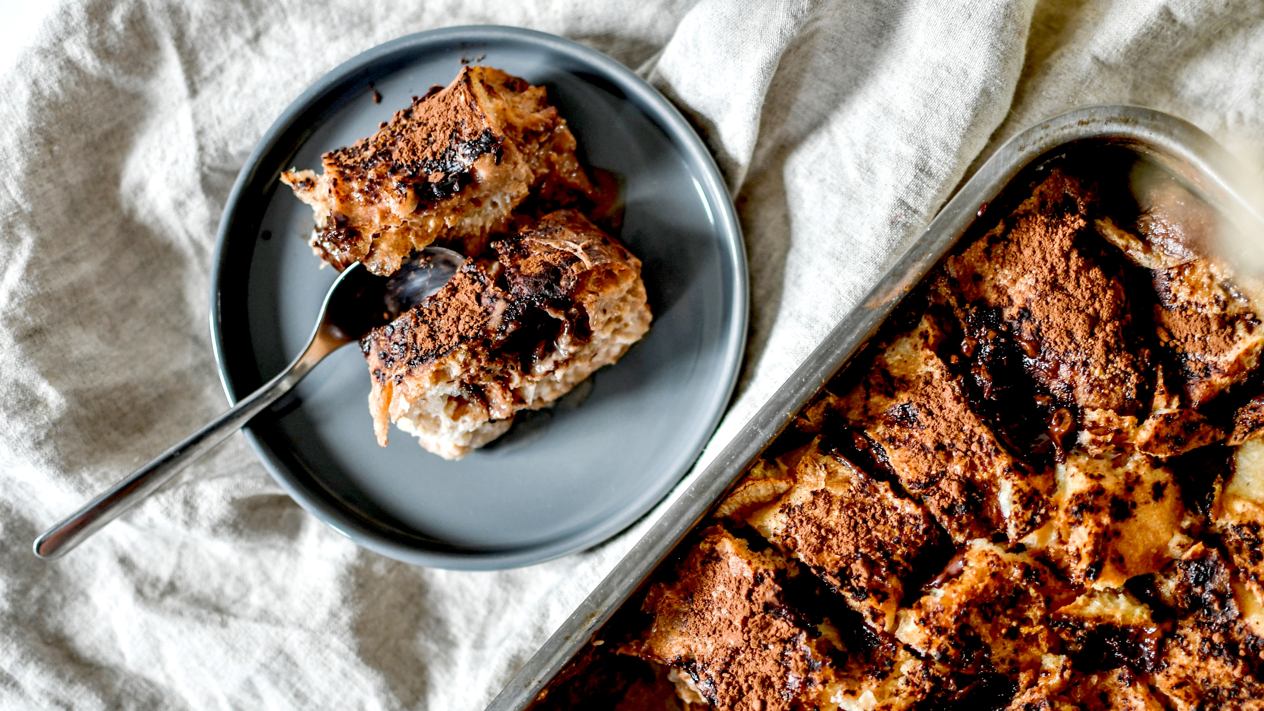 Verser le tout dans un plat à gratin. Bien répartir les morceaux de pain et insérer entre chacun des fondettes (ou pépites). Saupoudrer d’un peu de cacao (facultatif).