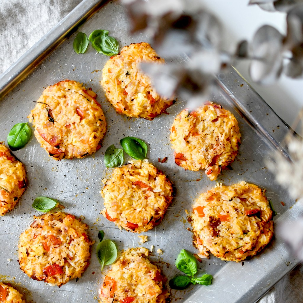 Cette recette, je l’ai réalisée avec un reste de riz. Mon alimentation en ce moment est assez simple : riz, légumes de saison et œufs … simplement par grosse flemme de cuisiner, et manque de temps. Du coup j’essaye un peu d’innover et de rendre ces aliments plus agréables à manger. L’idée des galettes au four est plutôt concluante je dois dire. Le résultat est à la fois croustillant sur le dessus et moelleux à l’intérieur. La fet, qui a légèrement grillé offre une texture onctueuse et un peu acidulée. Et puis les tomates et les poivrons … olala comme je les attendais ceux-là. J’avais tellement hâte.