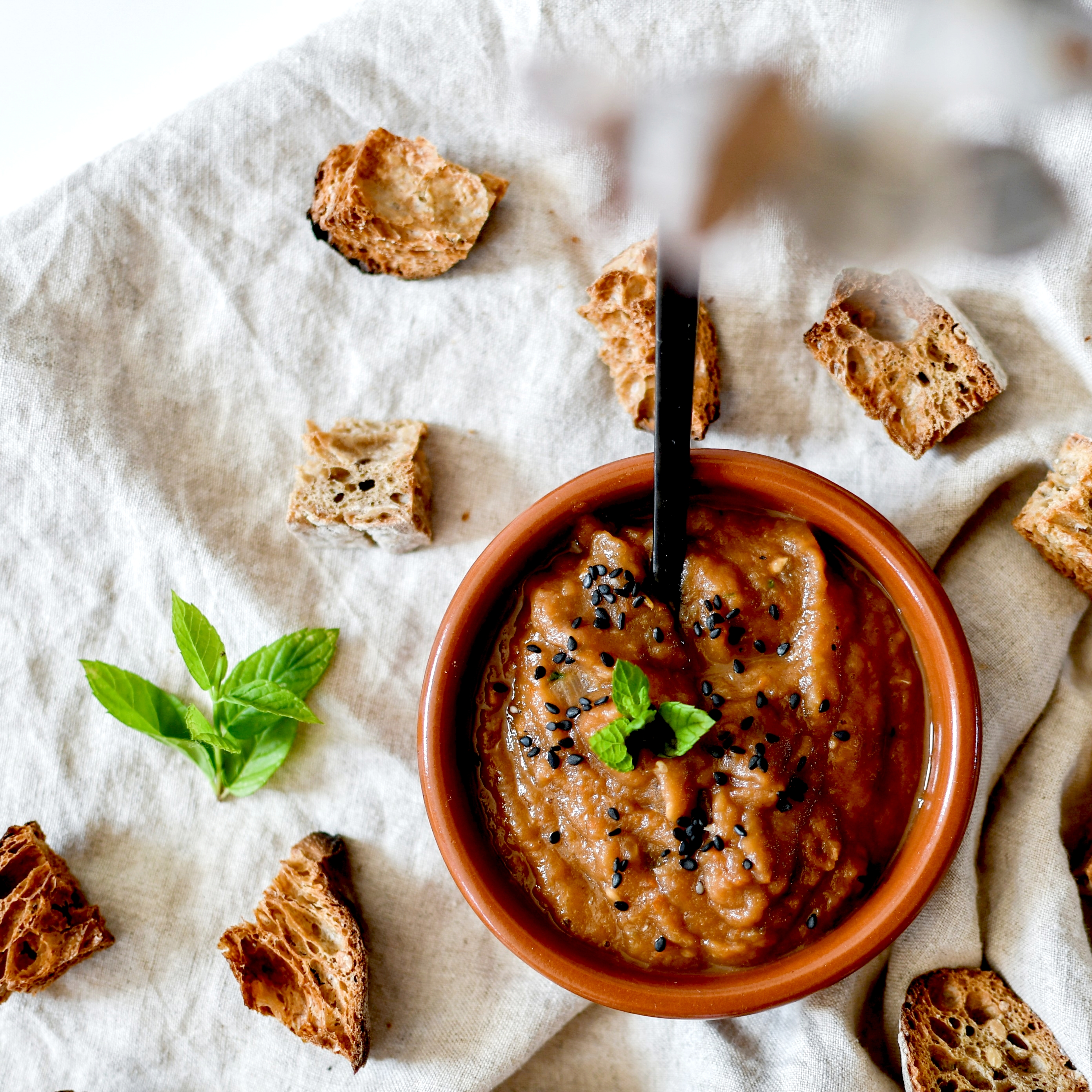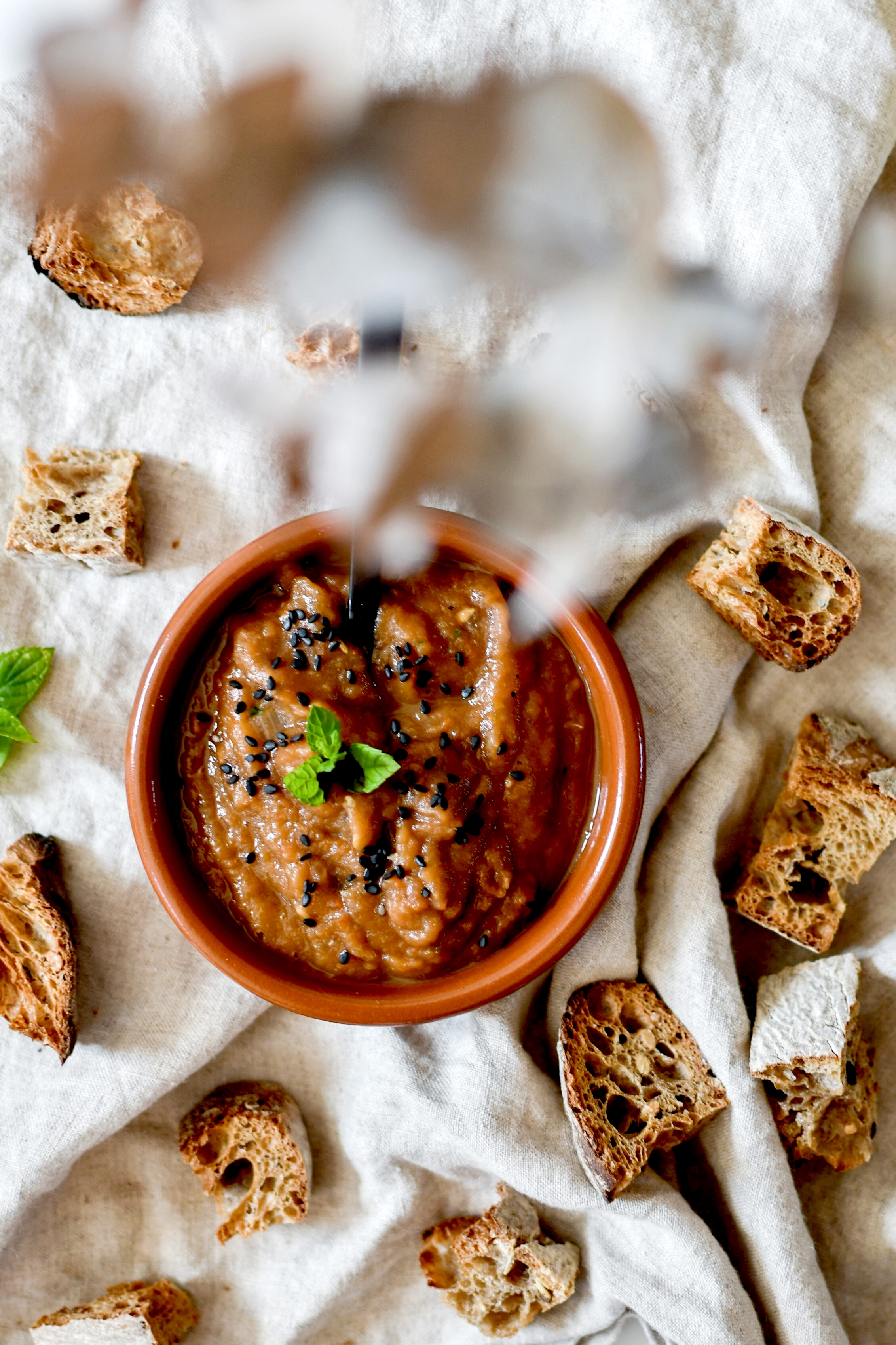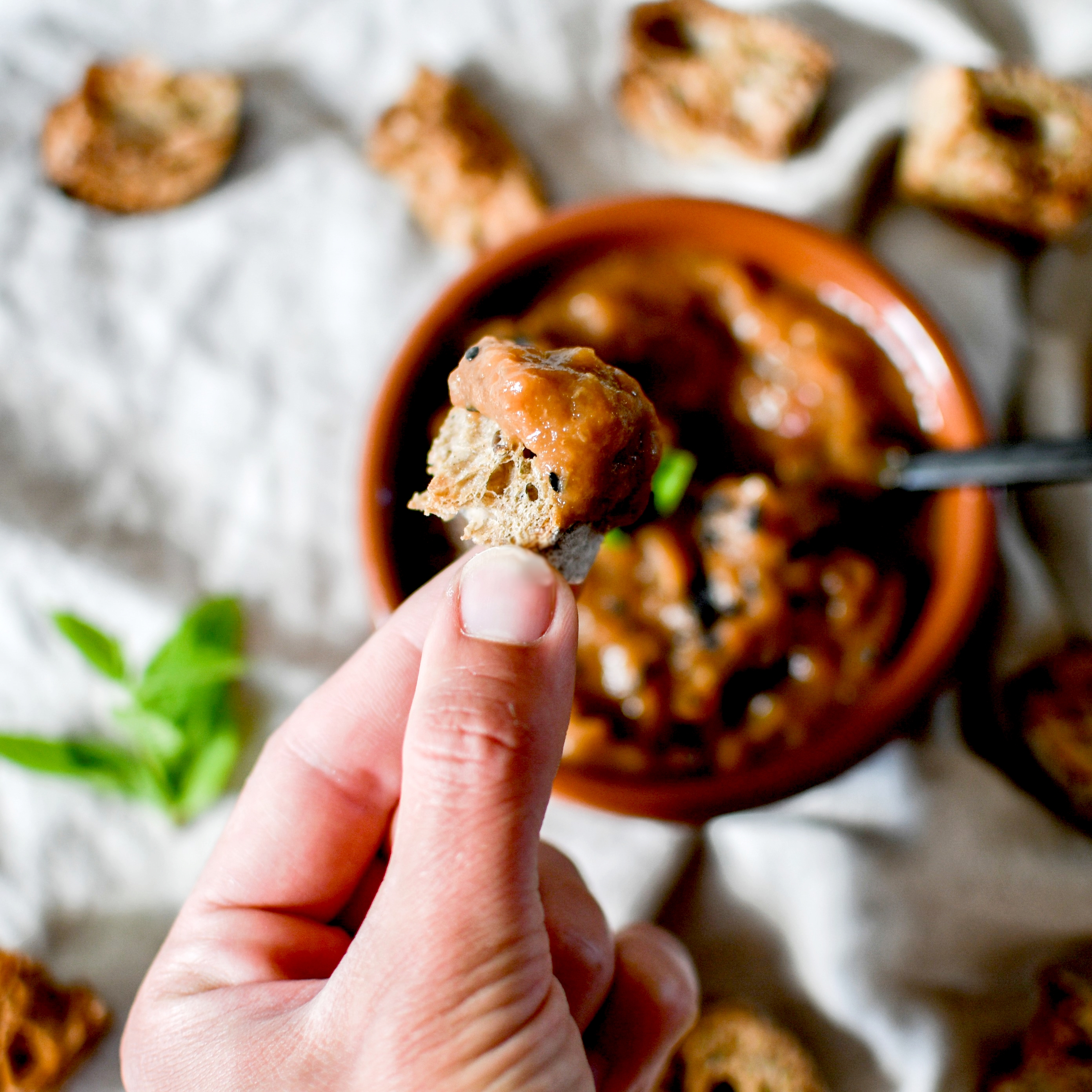 Pour tout le reste, il suffit de suivre la recette (qui encore une fois est ultra facile) et de faire travailler son imagination pour le service : dans des wraps avec des légumes, du pain pita, sur une viande, du riz, des pâtes, une belle tranche de pain de campagne, avec un peu de feta ou de parmesan … dans un gratin, une moussaka ou encore une shakshouka … tout peut y passer. Ici, je les ai simplement servi à l’apéro avec de petits croûtons maison et des légumes pour en faire des dips. On peut même la conserver en bocal stérile comme une sauce tomate, et ne la ressortir que cet hiver. Bref ! Une sauce, mille recettes, mille régalades.