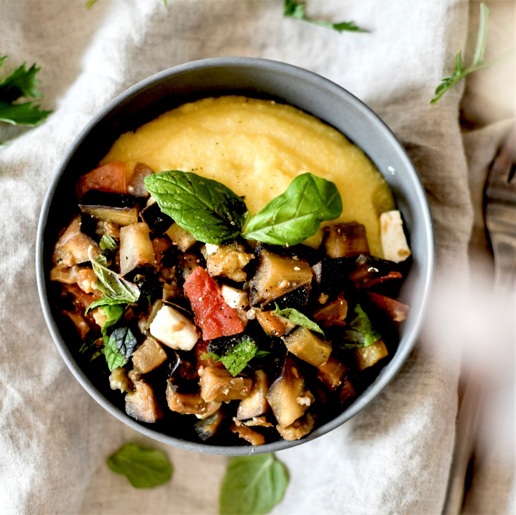 La recette que je vous propose aujourd’hui est d’une simplicité absolue mais tellement délicieuse et onctueuse qu’on ne peut rêver mieux en ce moment. Les légumes fondants, la menthe et le basilic, la feta … un petit air de Grèce ou de Proche Orient, le tout sur un lit de polenta fondante en bouche et qui transporte immédiatement en Italie. C’est un régal pour les papilles, à tout petit prix et 100 % de saison.
