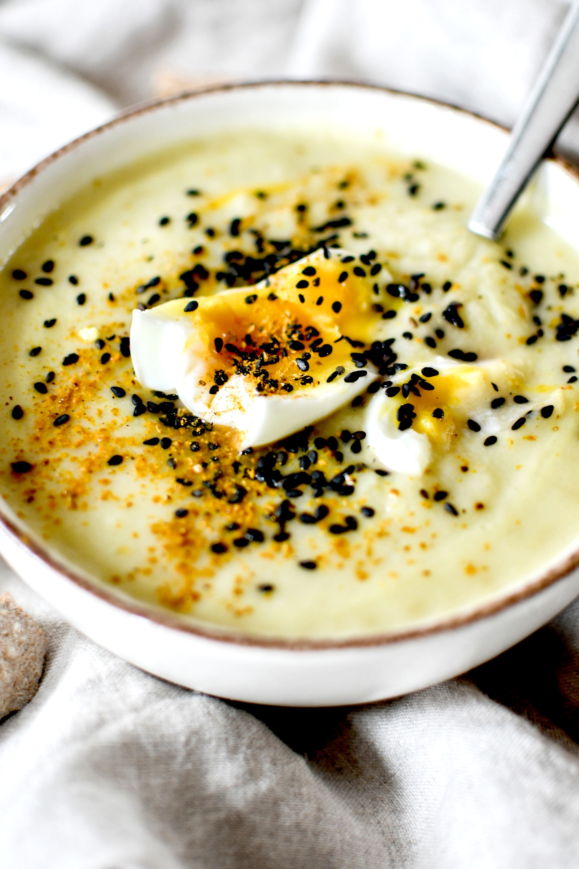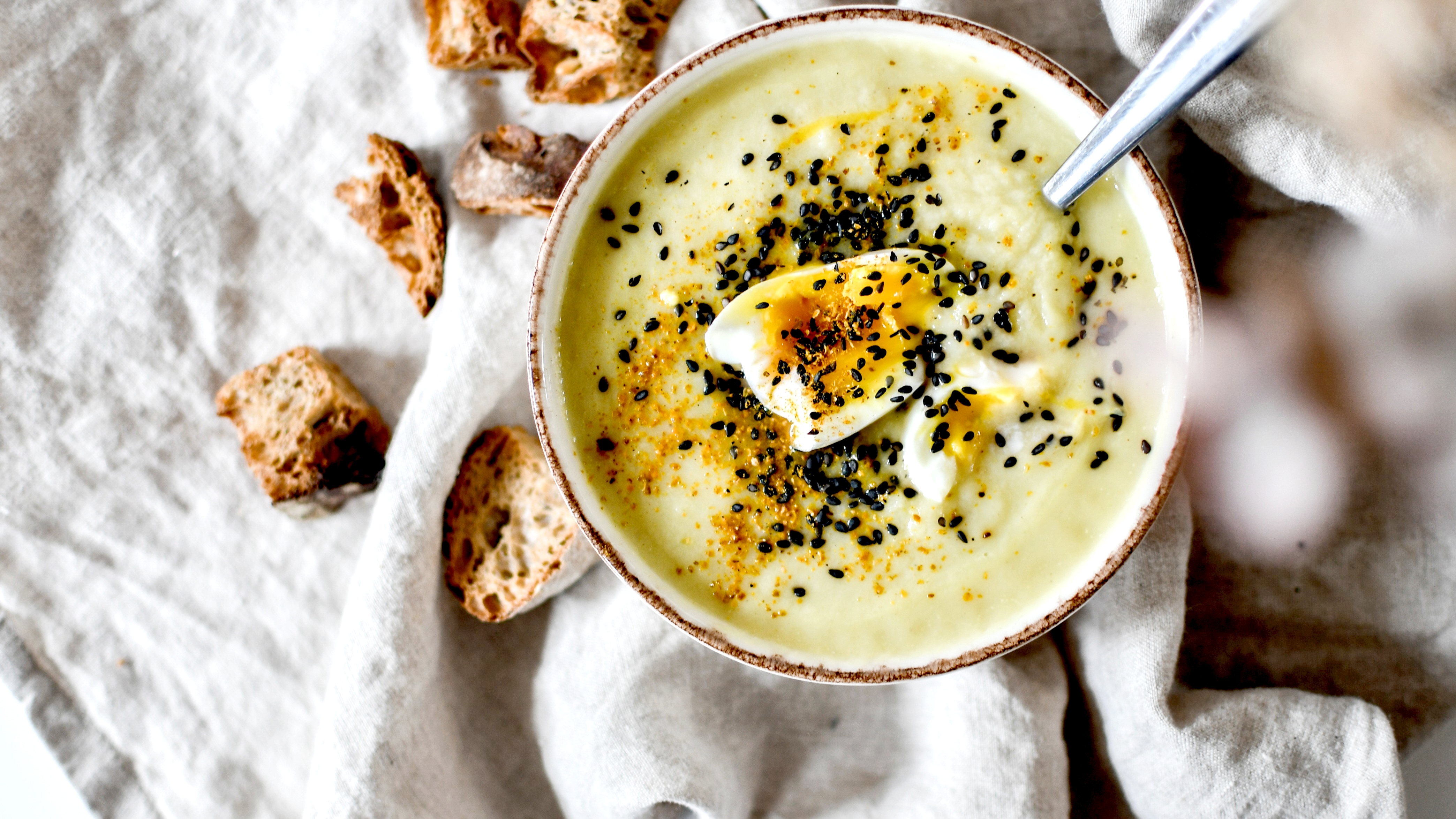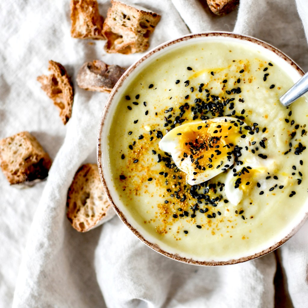 Ce qui est chouette, c’est de faire une soupe gourmande, customisable avec des croûtons, des œufs, des graines et des épices … D’autant que le chou et la rutabaga ne sont pas des légumes « faciles » au sens où leur goût est prononcé, parfois un peu amer. La technique c’est donc de les mélanger à des produits beaucoup plus doux et qui vont contrebalancer et équilibrer les saveurs : des pommes de terre, du yaourt ou du fromage blanc, du lait de coco … J’ai ici utilisé le lait de coco de chez KAZIDOMI (le seul que j’achète encore de temps en temps, pas tout le temps) et un curry indien que j’adore : celui de la marque bio Masalchi.