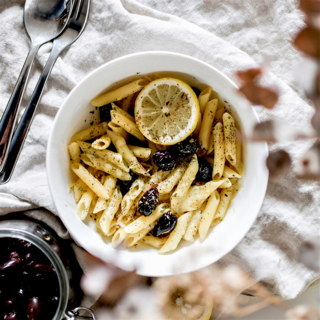 J’ai choisi d’utiliser des penne (enfin, on ne peut pas dire que ce soit un véritable choix vu qu’il ne me restait que ça), elles sont parfaites pour ce type de recettes car la sauce et le jus s’y imprègnent bien – mais évidemment vous pouvez utiliser n’importe quelle sorte de pâtes, remplacer les olives noires par des vertes ou encore ne pas y mettre de fromage pour une version végane. Ce qui compte, c’est que ce soit gourmand et que ça nous plaise.