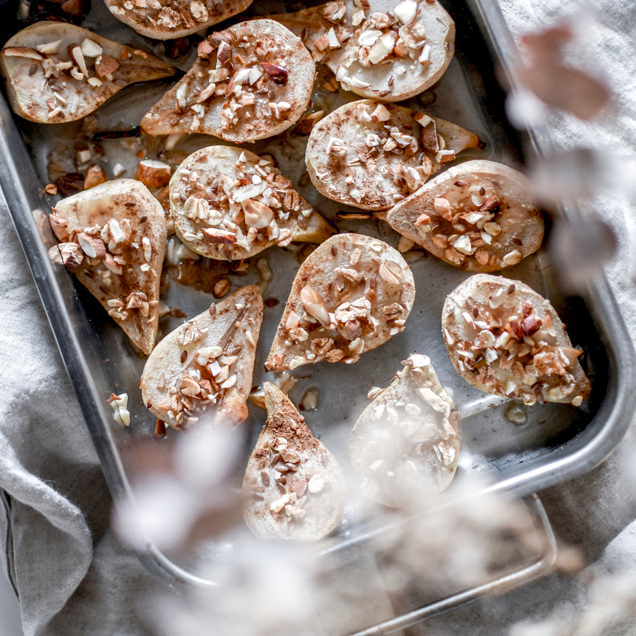 Cette semaine on a acheté un kilo de petites poires bio et locales chez Côté nature. Elles étaient encore un peu dures ce qui m’a donné l’idée et l’envie de cette recette. C’est vraiment un fruit que j’affectionne énormément. Je les ai donc simplement coupées en deux, recouverte de sirop et d’épices puis enfournées en attendant impatiemment le résultat.