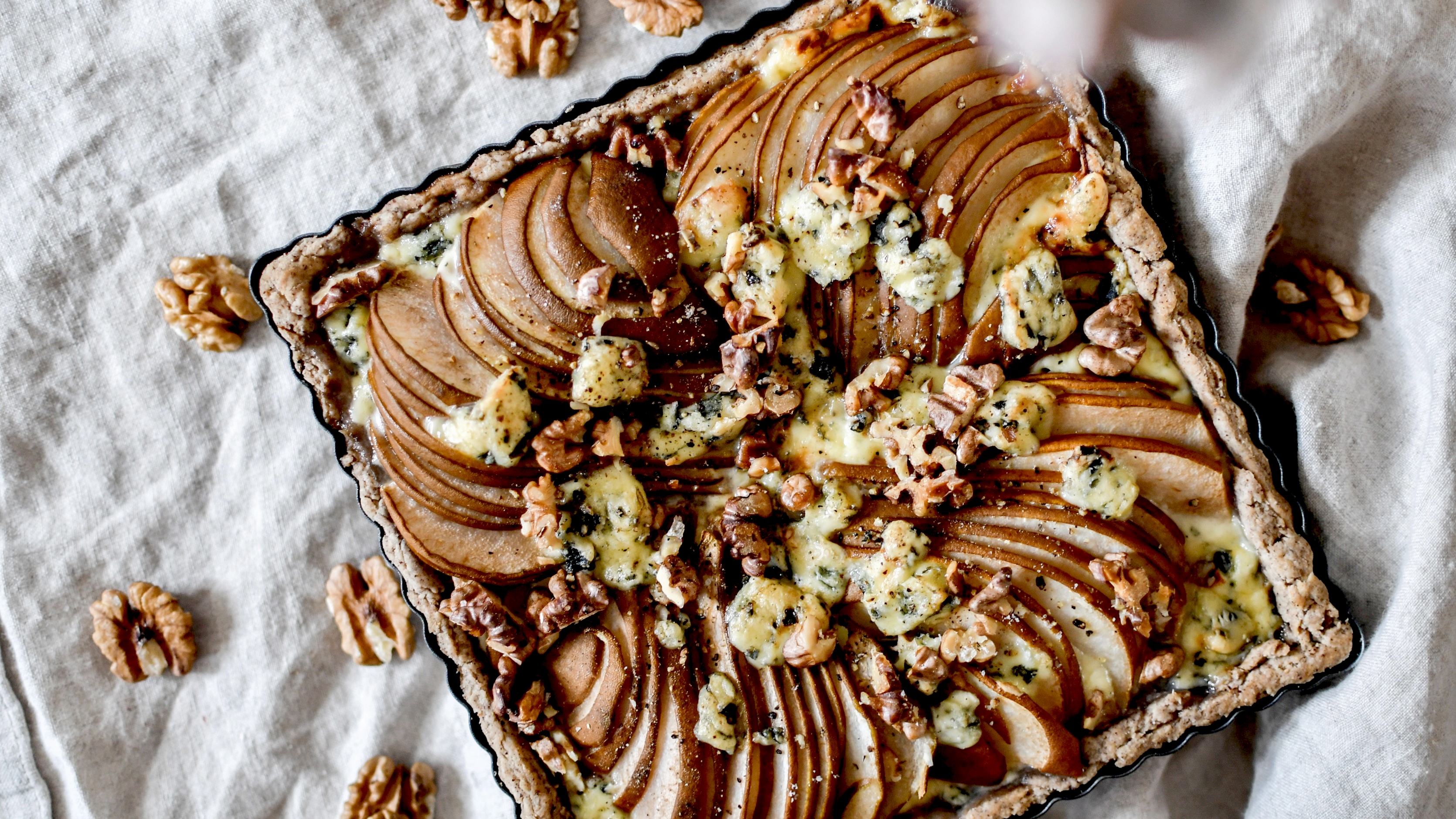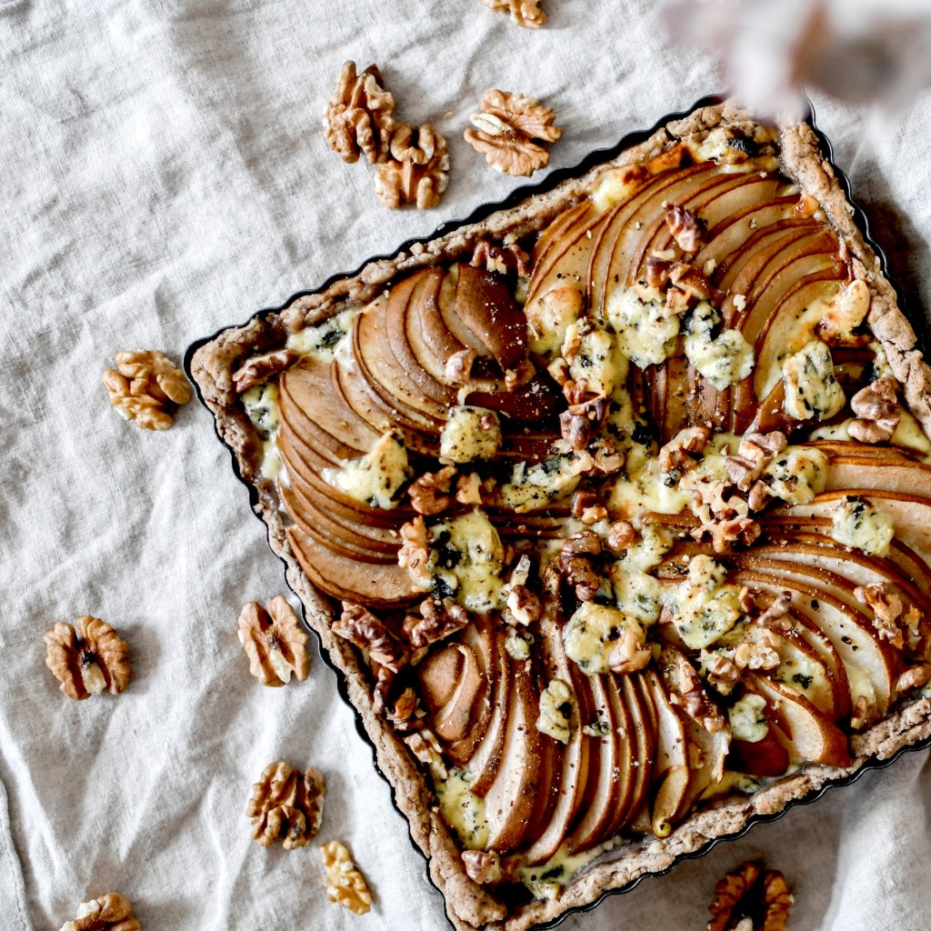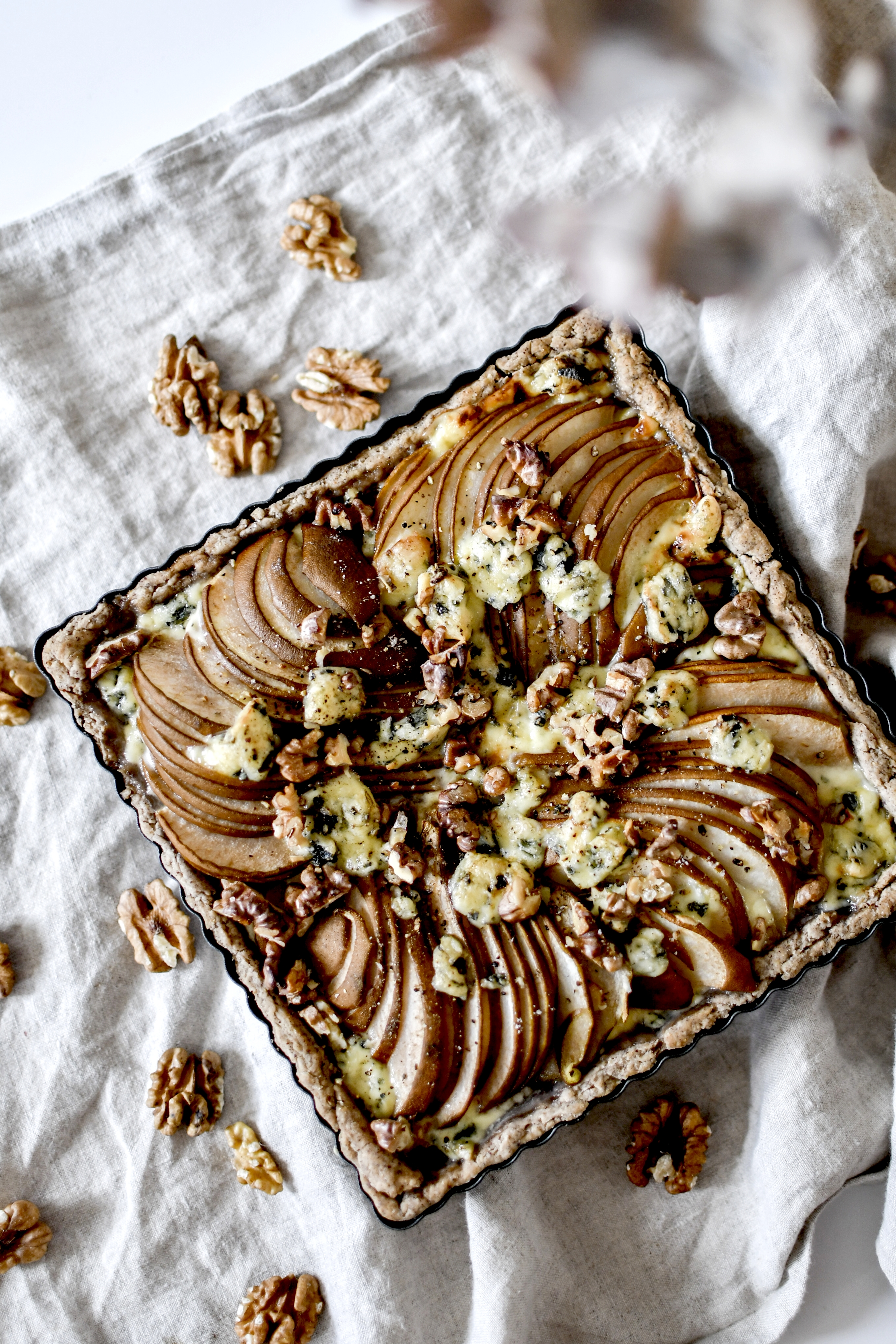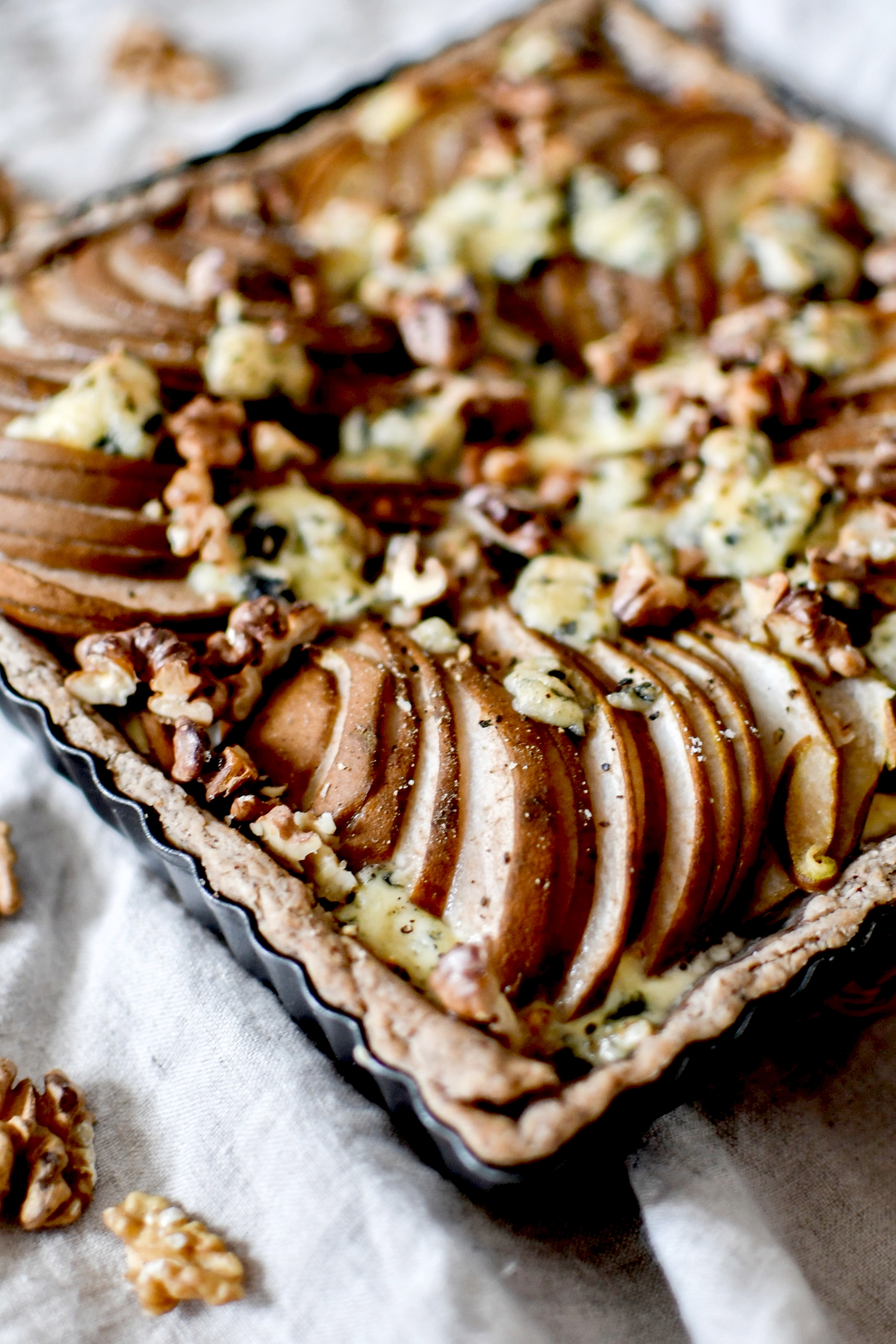 Les poires sont particulièrement adaptées à la cuisson au four. On peut en faire à peu près tout ce que l’on veut, et dans les recettes salées elles sont top. J’adore les associer au bleu (ici j’ai utilisé de la fourme d’Ambert mais on peut très bien y mettre du gorgonzola ou du roquefort). Le petit effet sucré salé est on ne peut plus plaisant, les noix ajoutent du croquant, de la texture et surtout beaucoup de gourmandise à la pâte sablée.