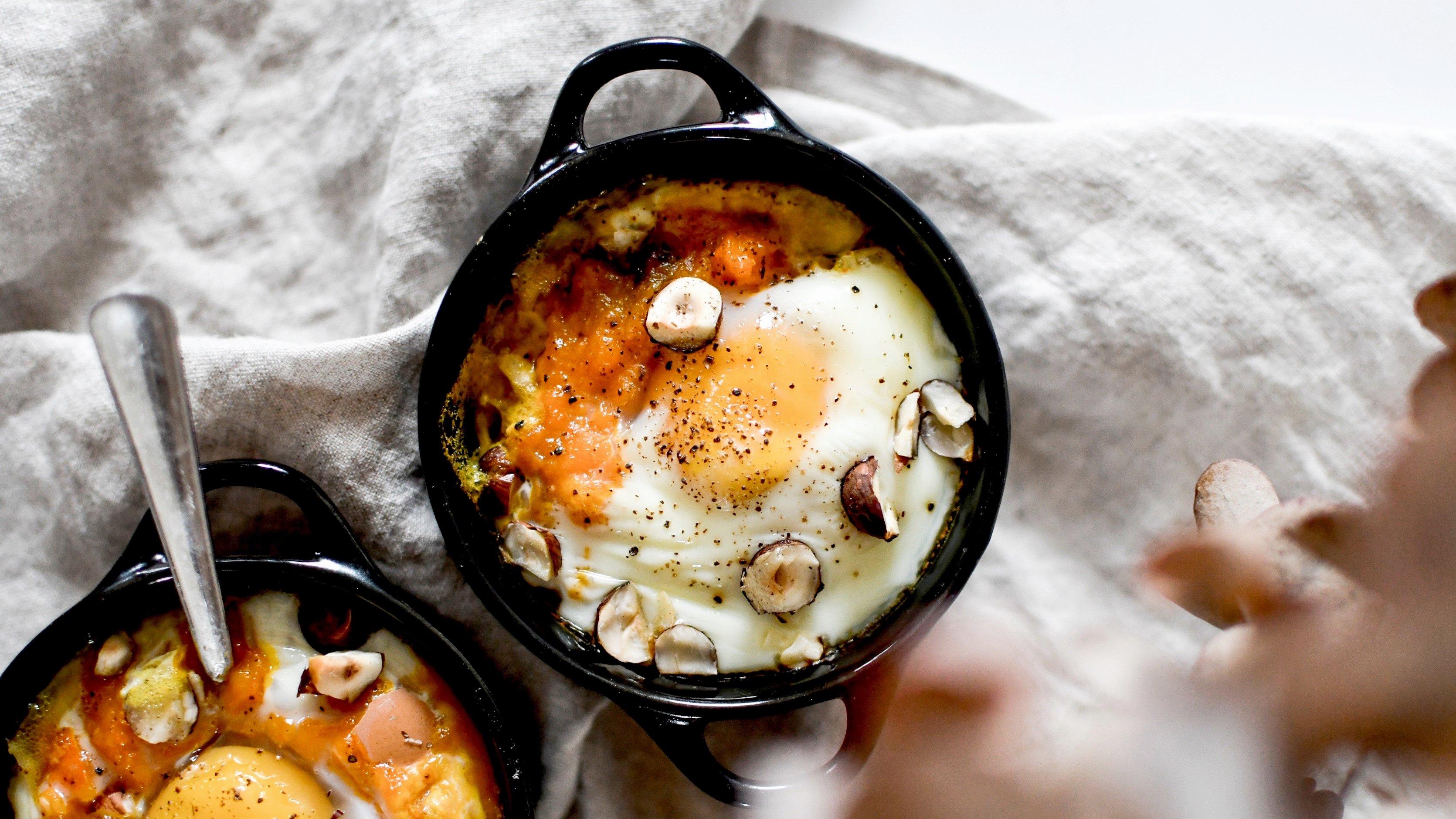 Les oeufs cocottes … ce petit plat doudou tout facile à faire. J’en suis bien bien fan, il y a d’ailleurs déjà quelques recettes par ici. Mais je crois que ma préférence va à celle là. Une explosion de douceur et d’onctuosité, avec cette purée de potimarron aux noisettes croquantes et ce jaune bien coulant qui se répand partout.