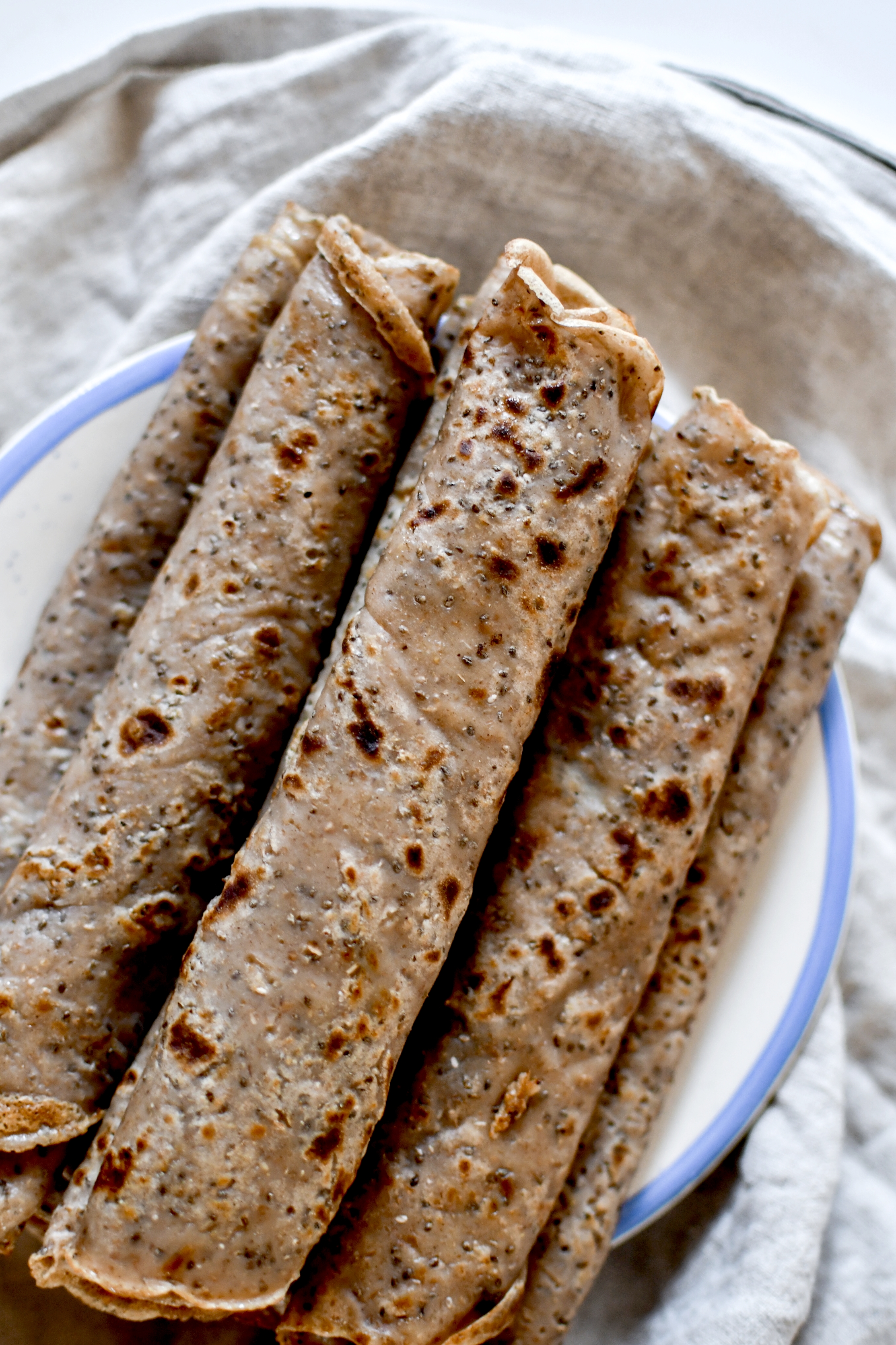 Pour le reste, on mélange la farine de châtaigne avec 50/50 de farine complète, on ajoute des graines de chia pour le liant (que l’on peut évidemment remplacer par 2 œufs pour une version non végane) et on utilise un bon lait végétal (recette du lait d’avoine maison ici si besoin).