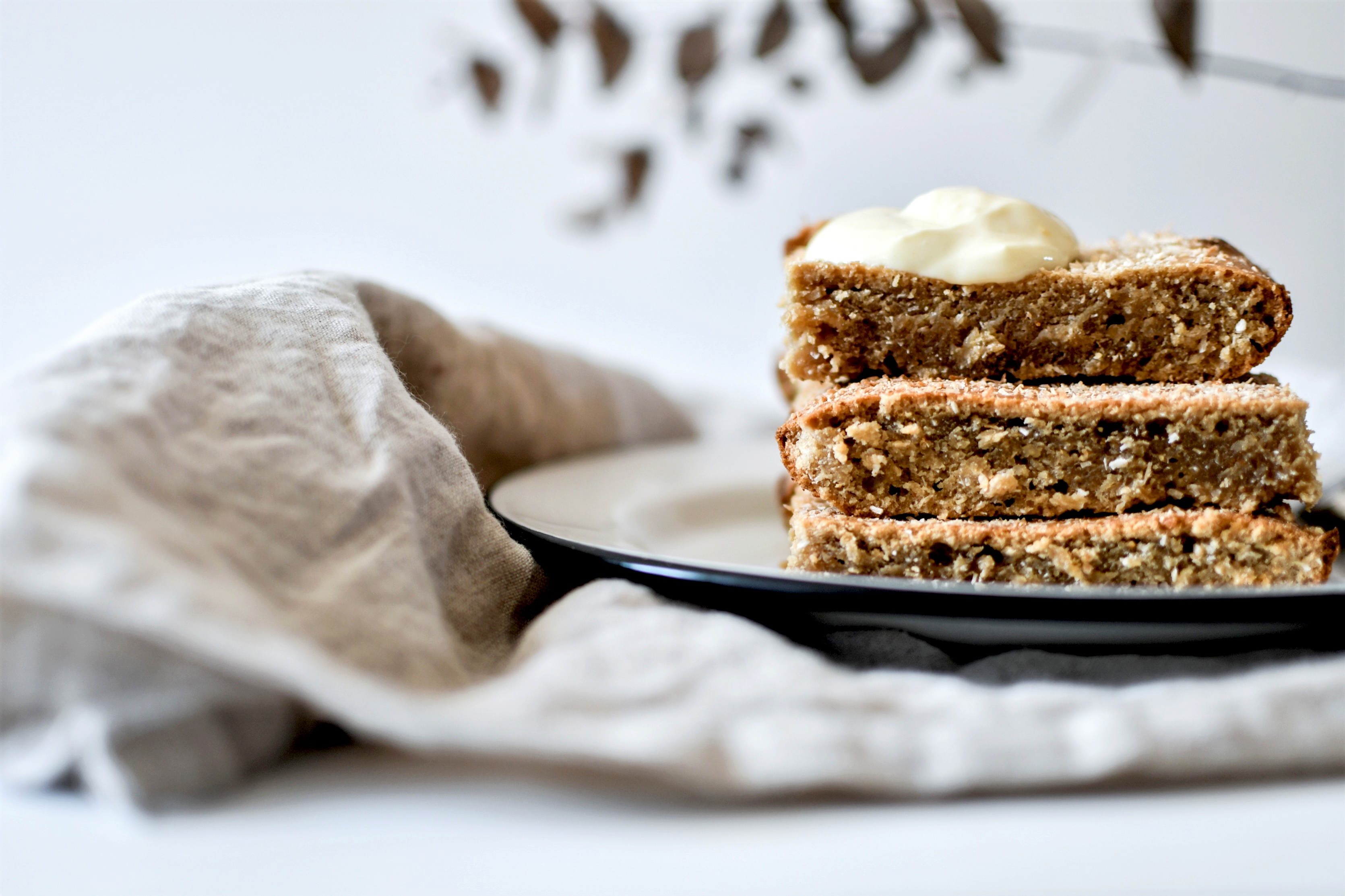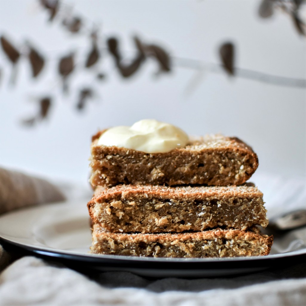 Cette recette est une petite invention. Il me restait des tas de produits à base de noix de coco : sucre, lait, huile … mais pas suffisamment pour en faire quelque chose. J’ai donc décidé de tout combiner dans un seul gâteau et le résultat est plutôt convainquant. Ces petits carrés à la noix de coco sont à la fois moelleux et gourmands. Ils sont parfaits pour le petit déjeuner car nourrissants, complets et sains. On peut les dévorer comme ça, ou avec de la confiture, du beurre de cacahuète ou comme moi, avec du yaourt (j’adore mélanger les textures et tremper les cakes dans le yaourt … c’est une vraie passion).