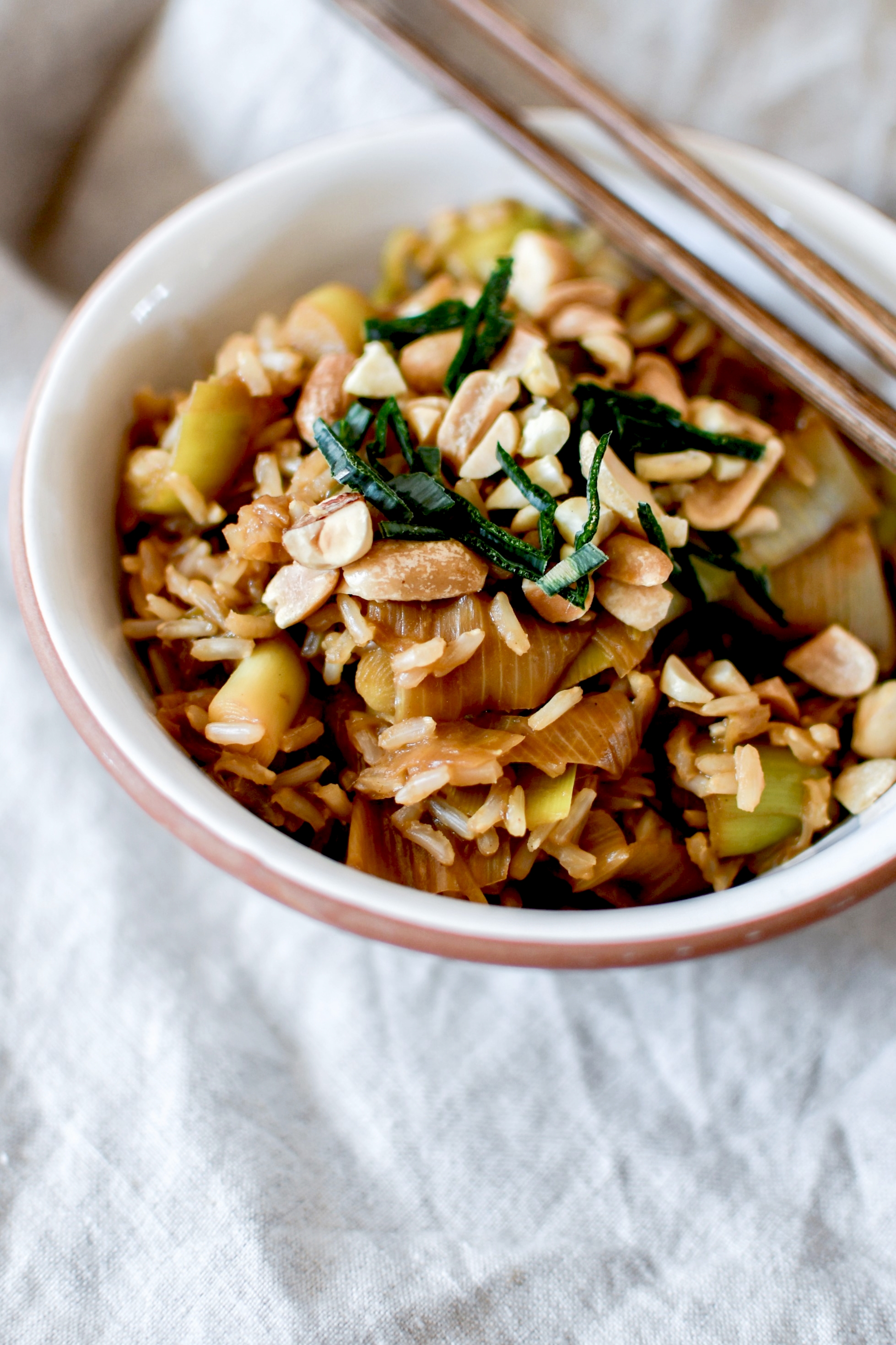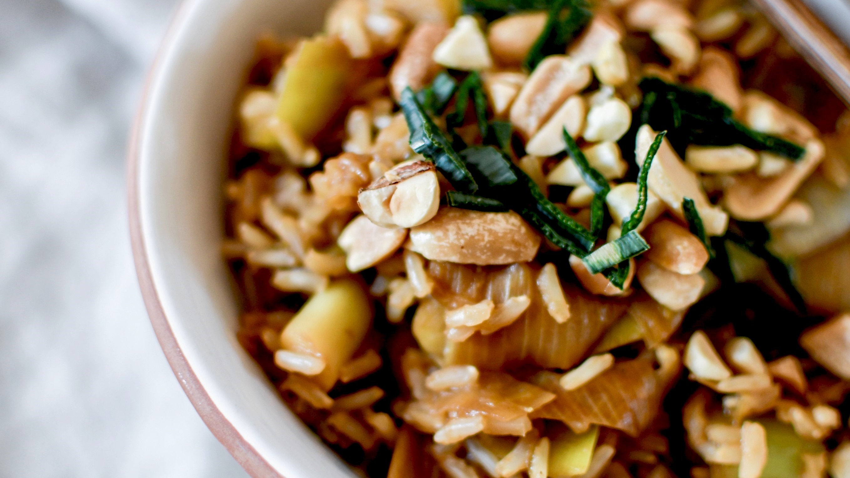 Une fois servi, saupoudrer de cacahuètes et de verts de poireaux finement ciselés.