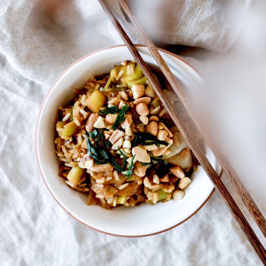 Laver et tailler les blancs de poireau en fins tronçons. Les faire fondre dans une grande sauteuse avec un fond d’huile d’olive te un peu d’eau. Une fois qu’ils sont bien cuits ajouter le sirop d’agave, la sauce soja et le beurre de cacahuète préalablement bien mélangés ensemble.