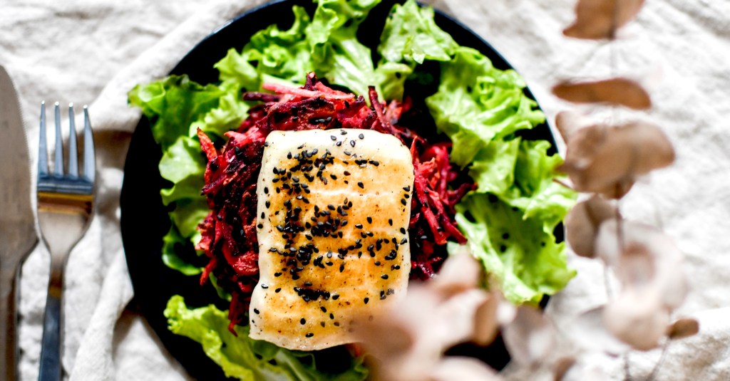 Avant de servir, faire griller des tranches en haloumi et les déposer sur chaque portion. Saupoudre de sésame noir pour la deco.