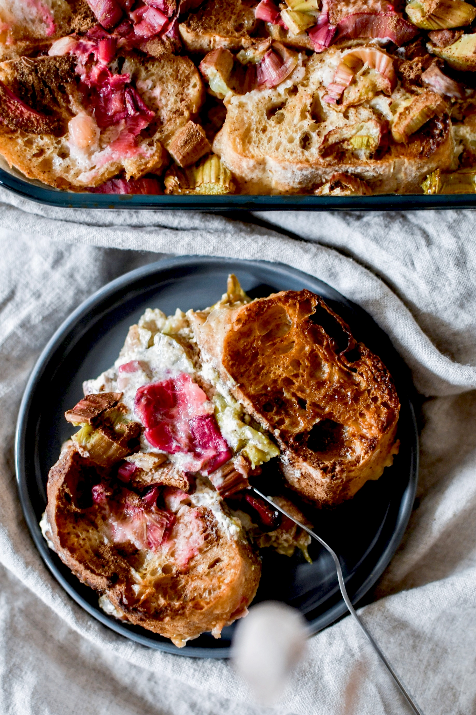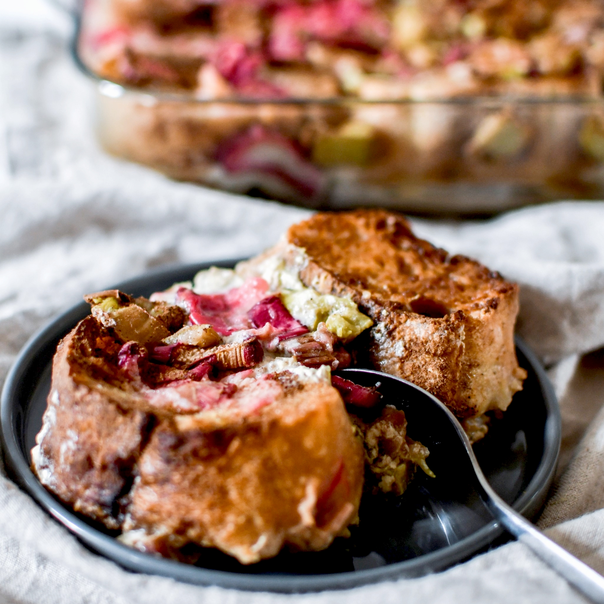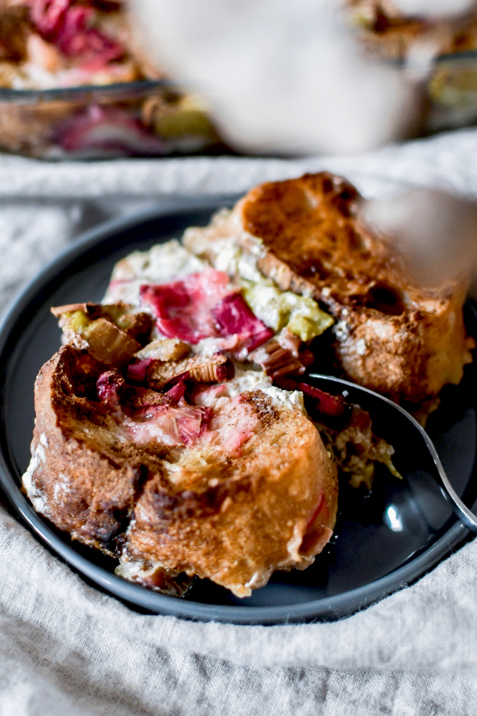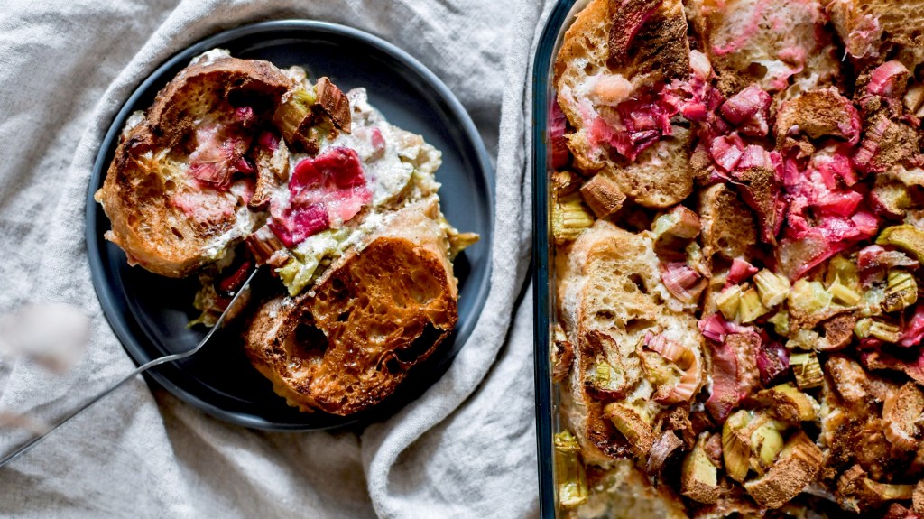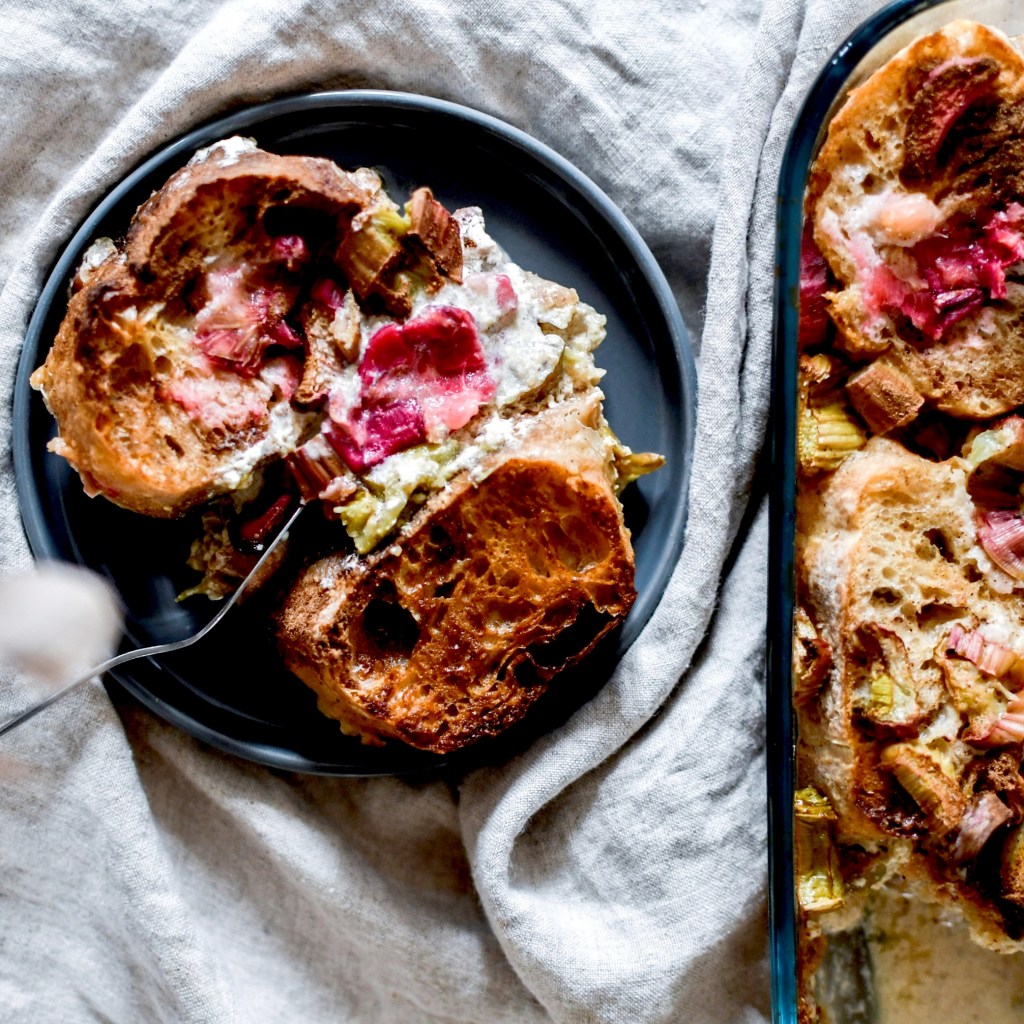 La semaine dernière j’ai acheté beaucoup trop de pain. On s’est donc retrouvé avec deux baguettes toutes dures et bonnes à donner aux chevaux. Mais vu qu’on n’a pas de cheval … je les ai transformées en pain perdu bien gourmand. Avec de la rhubarbe incroyable des jardins de la Montagne Verte (énorme et bien rose), du lait végétal pour une version sans lactose et du sucre de coco pour un indice glycémique plus bas sans en ôter la gourmandise.