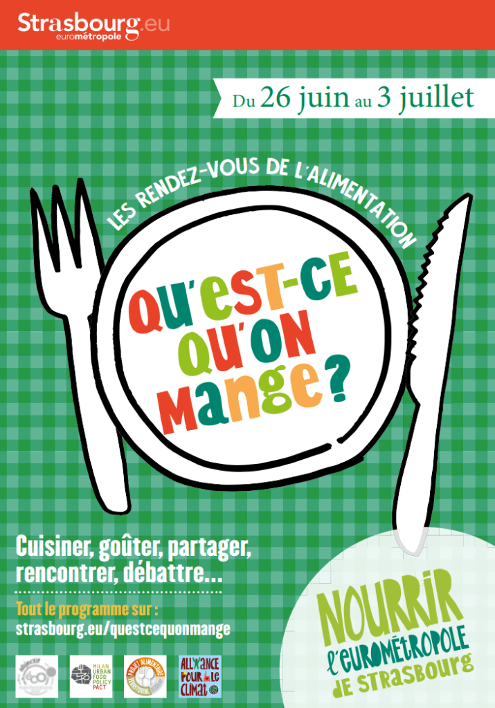 Du 26 juin au 2 juillet j’ai l’honneur de participer à ma manière au grand événement organisé par l’Eurométropole de Strasbourg : « Qu’est-ce qu’on mange ? ». L’objectif : montrer à travers d’une série d’évènements, d’ateliers, de conférences qu’une ville aussi grande que Strasbourg peut nourrir ses habitants de manière plus saine, plus éthique, plus juste et plus durable en :