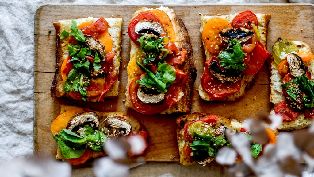 Déposer les morceaux de pain sur une plaque puis les garnir avec les légumes coupés en morceaux.