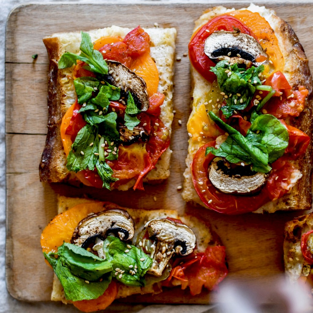Le principe est tout simple. On fait tremper les restes de pain dans un mélange de lait végétal et d’œufs, on les garnit de ce que l’on veut puis on passe le tout au four pendant 20 minutes. La mie est imbibée moelleuse et fondante, les bords légèrement croustillants et ça sent trop bon l’été.