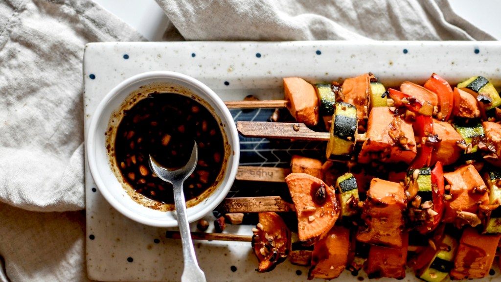 Le secret c’est la marinade légèrement sucrée et qui fait caraméliser les légumes. Il suffit de les y fait tremper pendant 30 min avant de les cuire puis de transformer le reste en sauce en la faisant réduire avec les cacahuètes. On arrose ensuite le tout à l’envie.