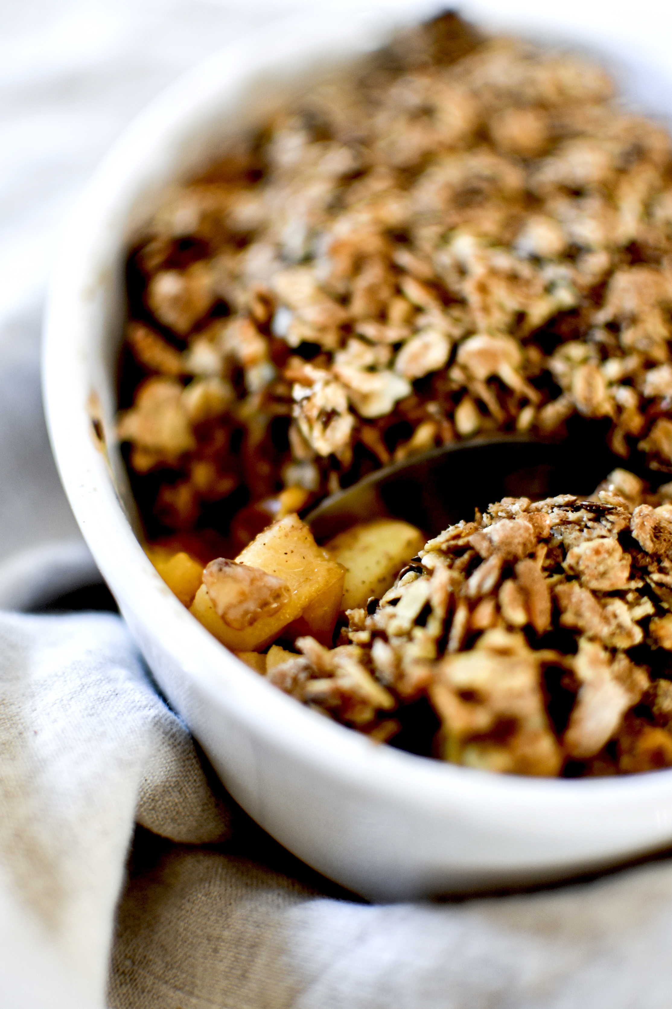 Il me restait des mirabelles un peu molles et j’avais envie d’un goûter sain et peu sucré, parfait avant ou après une séance de sport … ou même pour le petit déjeuner. Je les ai donc associées à des pommes pour une texture un peu plus soutenue, et surtout une bonne dose de muesli.