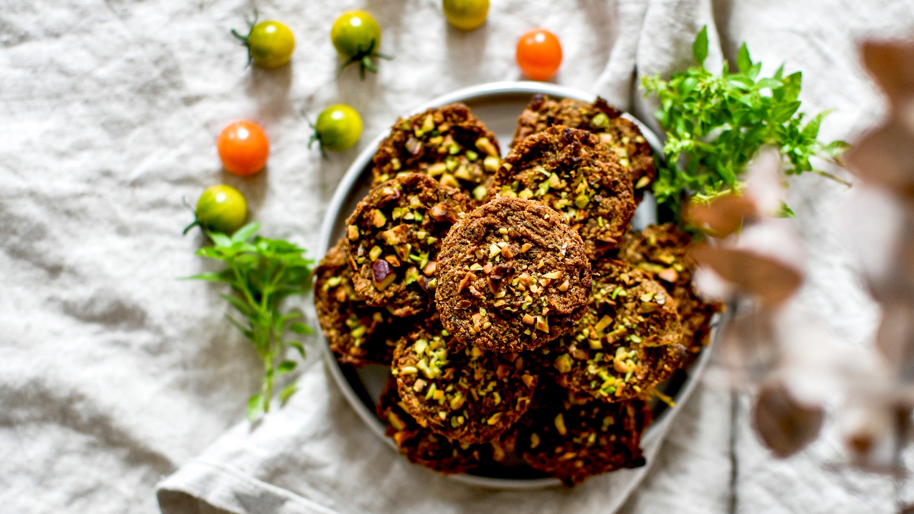 Former des boules de pâte et les déposer, comme ici, dans de petits moules à cake préalablement bien huilés (ou directement sur une plaque). A l’aide d’un pinceau, badigeonner les boule d’huile puis saupoudrer de pistaches concassées.