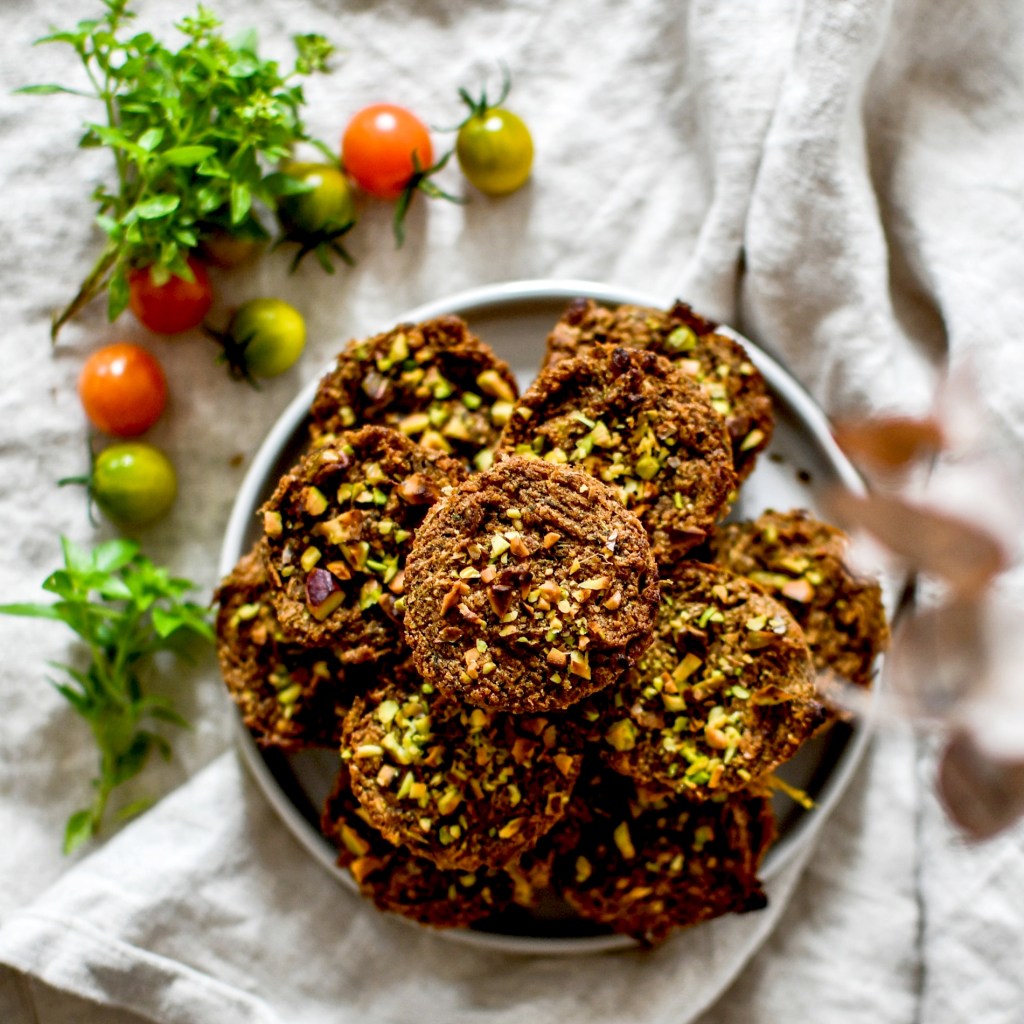 Ici je les ai mixées avec un reste de haricots rouges déjà cuits, un oignon rouge, de la purée de sésame, des pistaches et plein d’épices pour en faire des falafels à cuire au four (comme ici) ou dans l’huile.