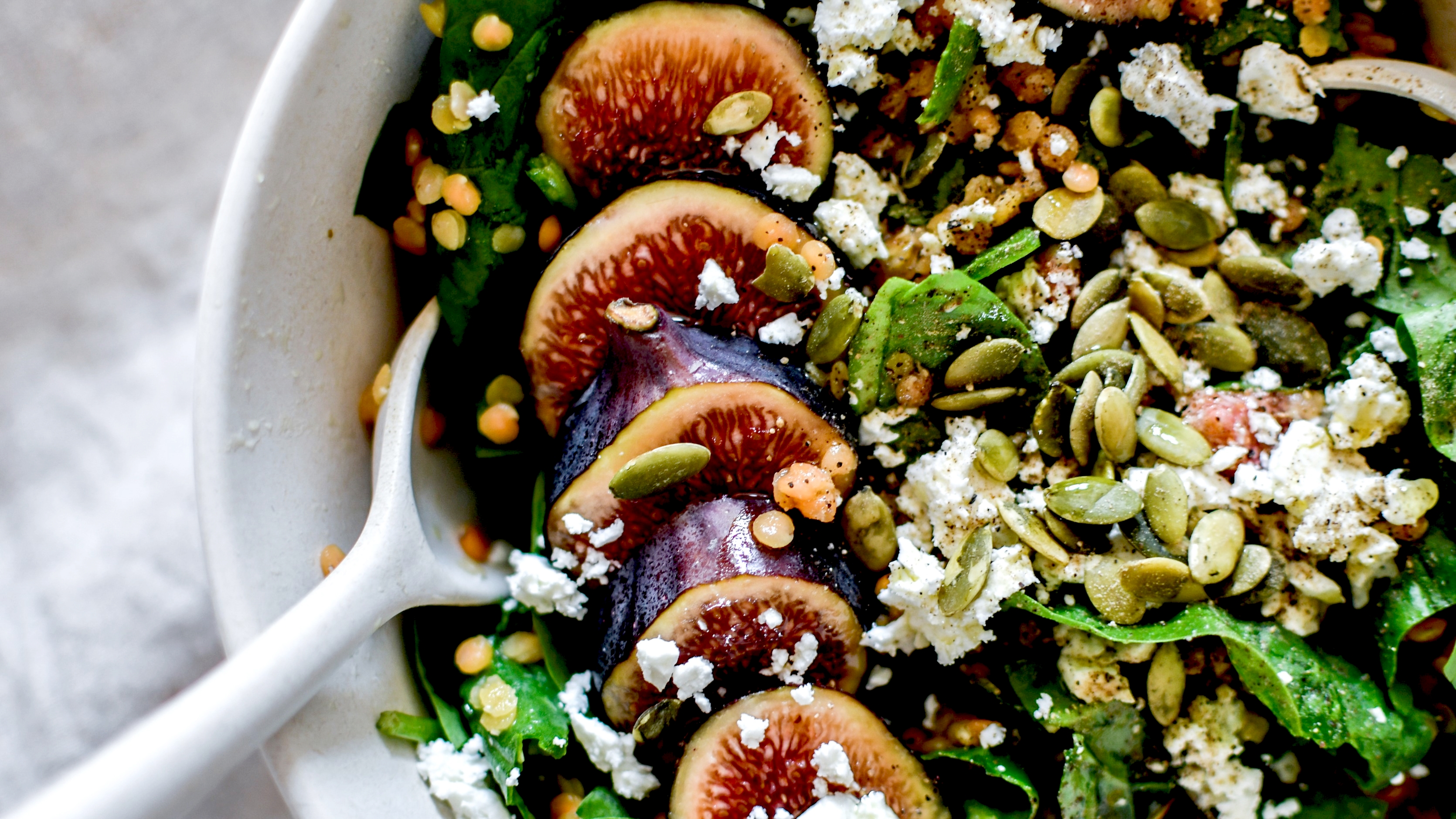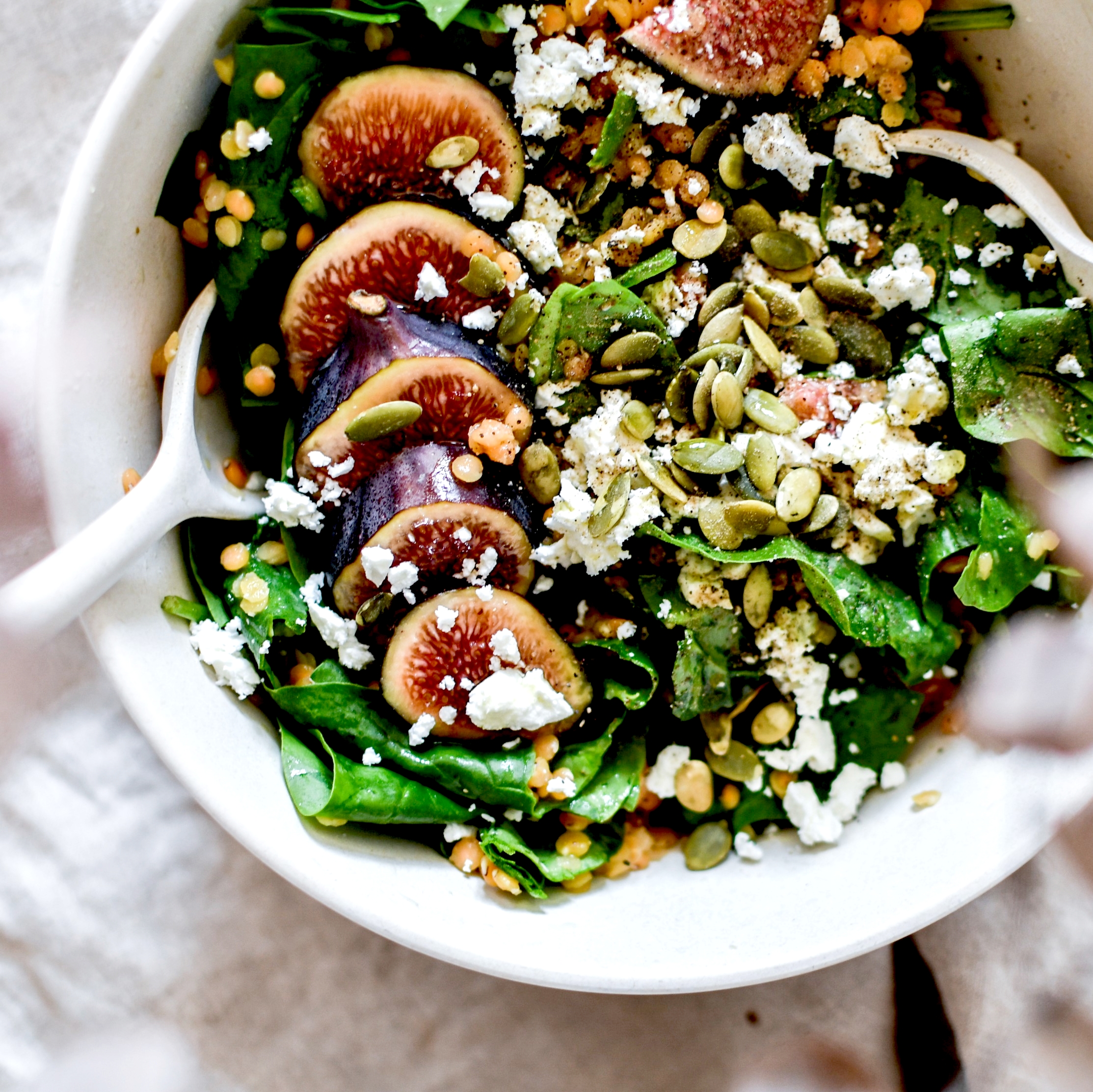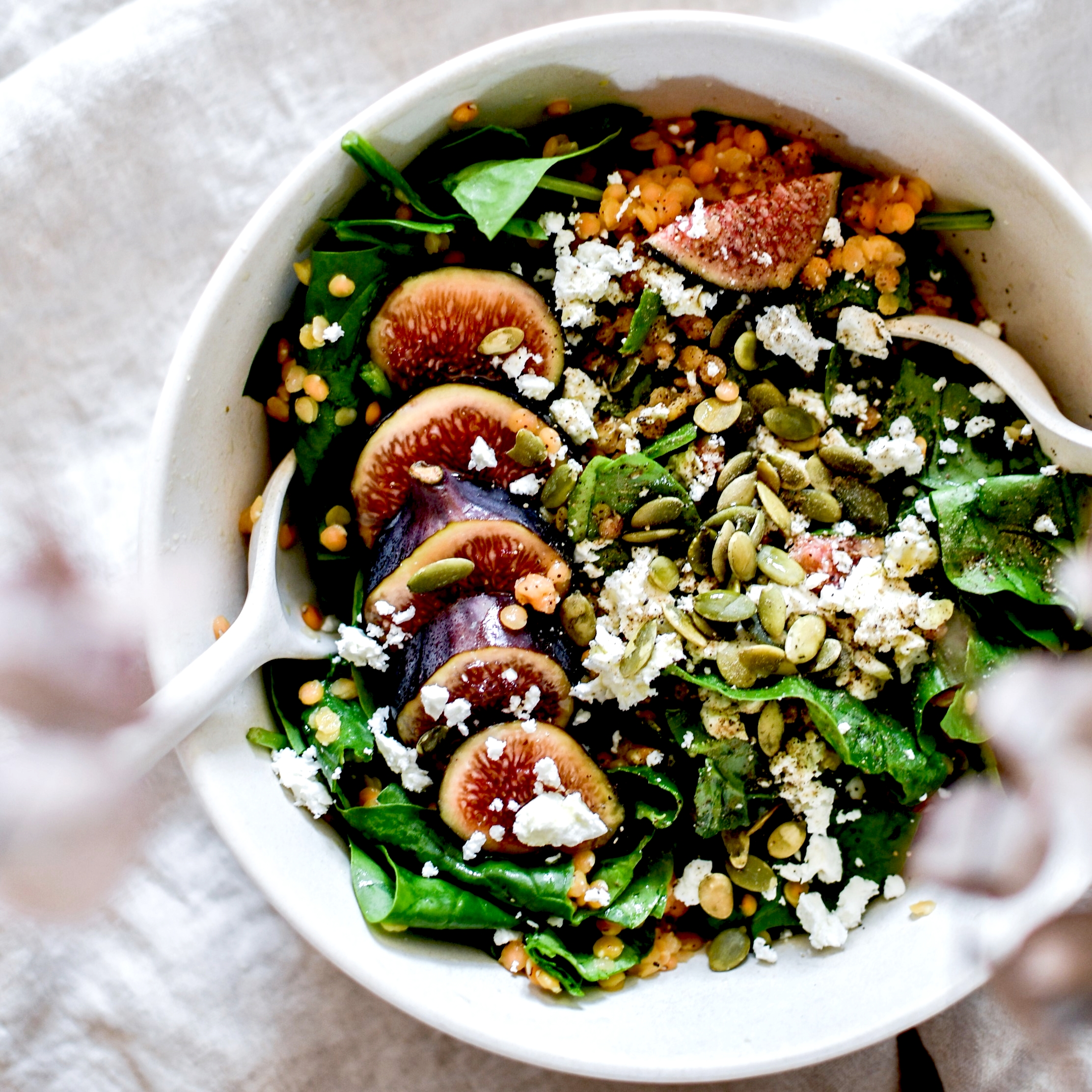 Le mélange de couleurs et de textures apporte énormément de fraîcheur, les figues de la douceur, les pousses d’épinards du peps et du croquant, et les lentilles lient le tout avec merveille. La feta est optionnel (pour une version végane) et on peut évidemment remplacer le balsamique par n’importe quel autre vinaigre ou du jus de citron (ce sera toutefois plus acide et moins doux).