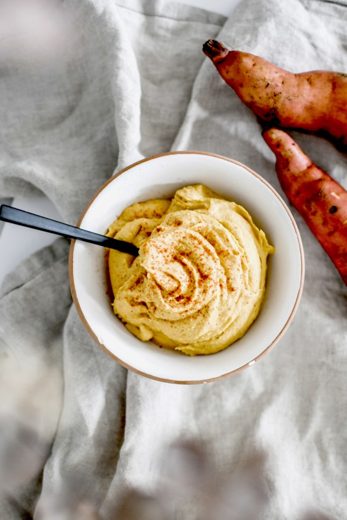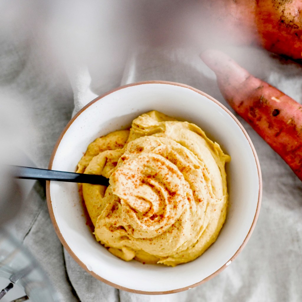 Pour ce qui est du reste des ingrédients, rien de plus simple. Les pois-chiches de chez day by day Strasbourg, de la patate douce locale (merci les jardins de la Montagne verte), le jus d’un citron, du tahini (ici celui de la marque Jean Hervé) et un loooong mixage. Tout le secret est là pour obtenir une texture à la fois lisse, mousseuse et onctueuse.
