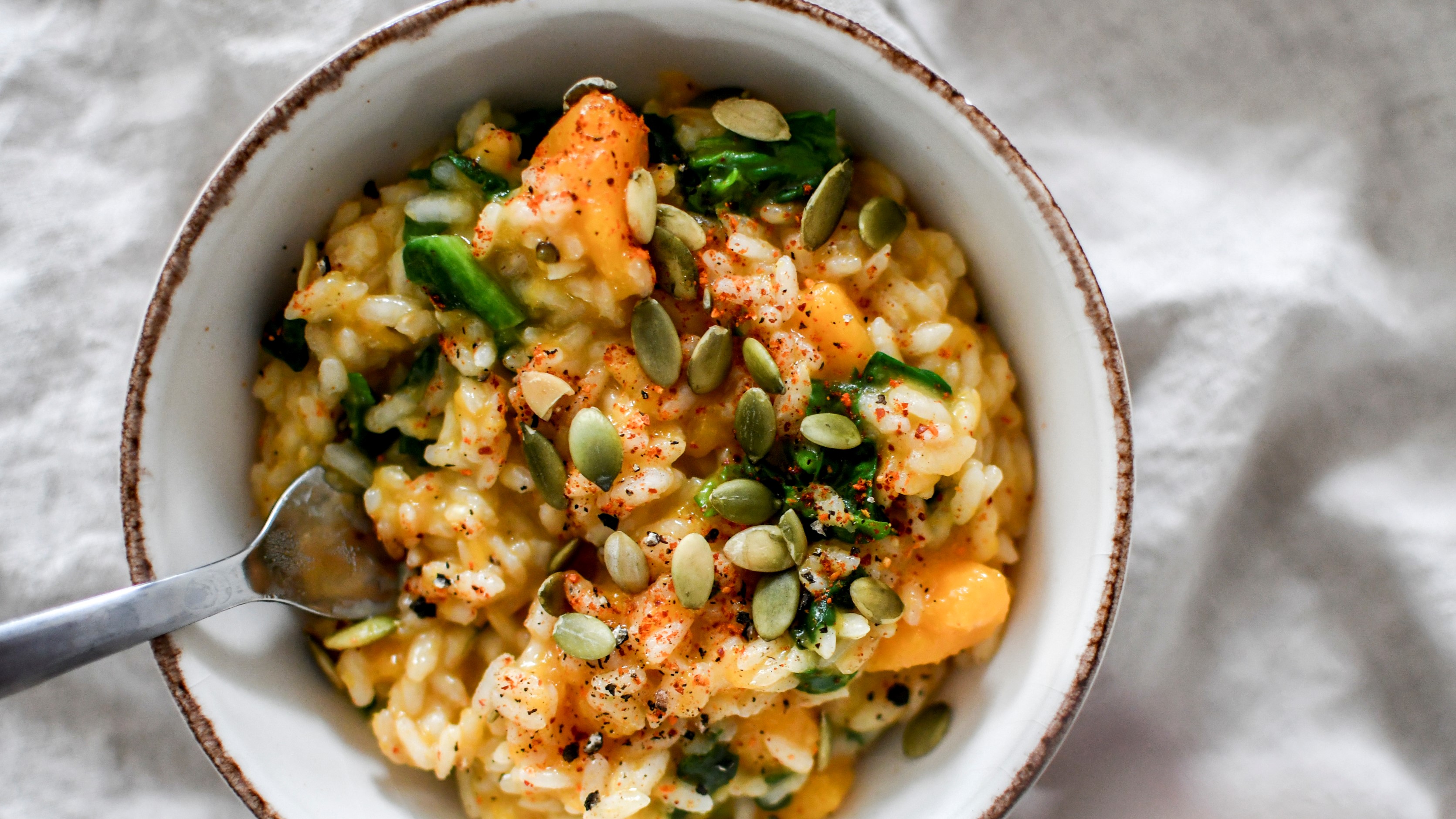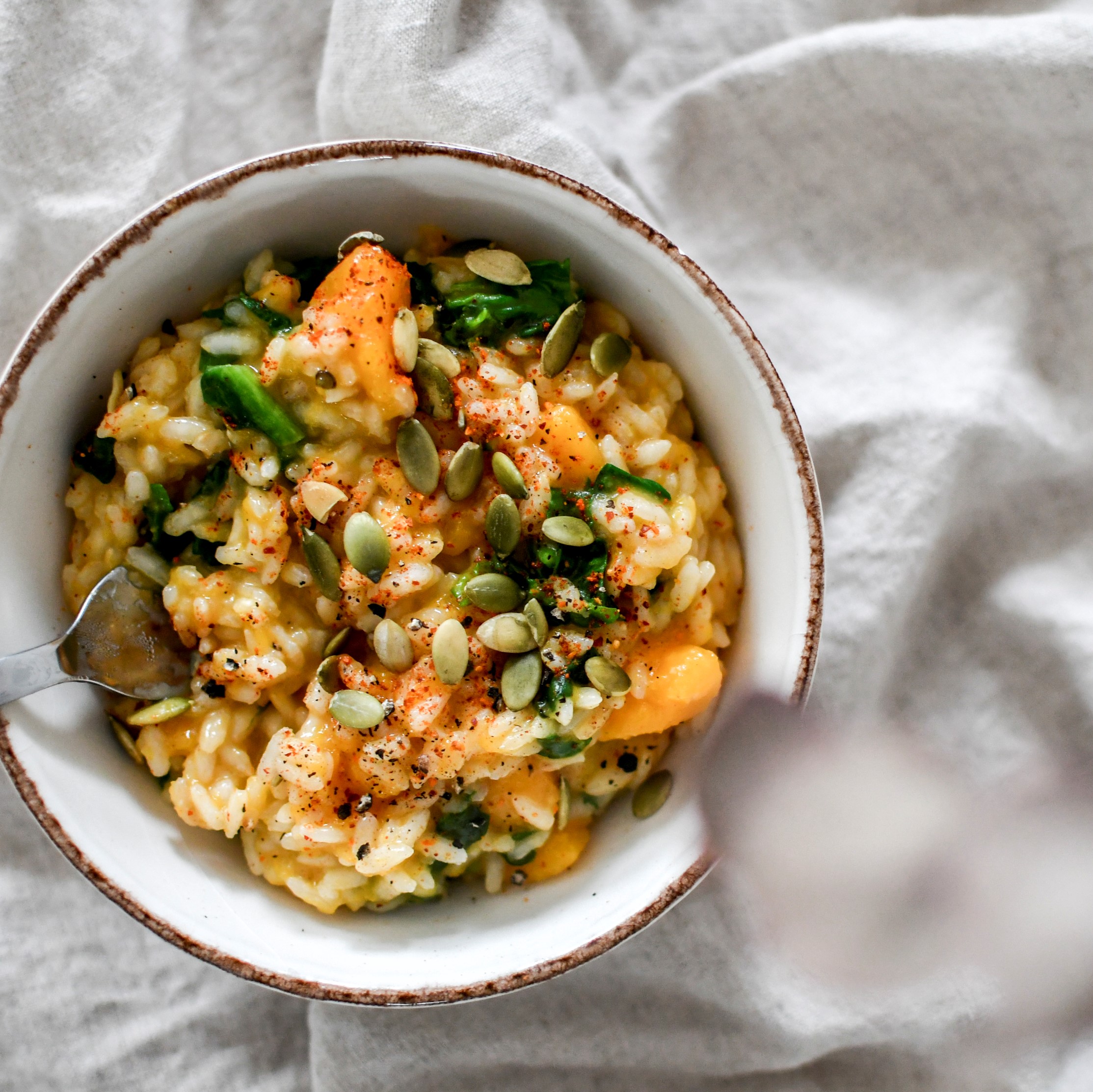 Ce genre de recettes passe partout, j’en suis fan. Idéal pour un lunch express ou un petit repas entre amis ou amoureux, ce risotto est tout doux, onctueux, facile à faire et pour le coup, vraiment de saison. J’adore associer les courges aux légumes verts de l’hiver (épinards, brocolis, pois cassés …). Elles adoucissent leur amertumes et ils équilibre leurs saveurs parfois un peu fades ou lassantes (bon j’avoue que je ne m’en lasse pas perso).