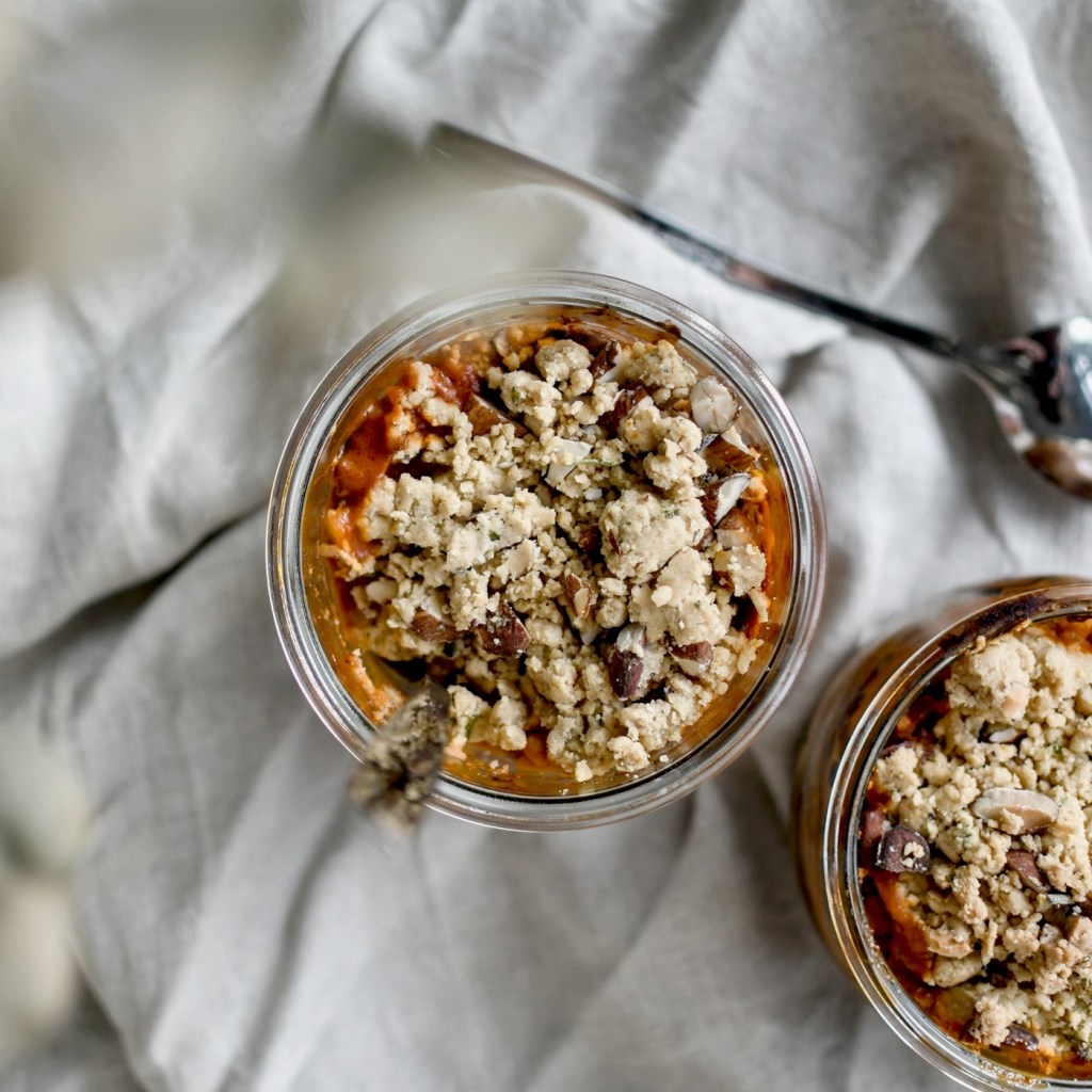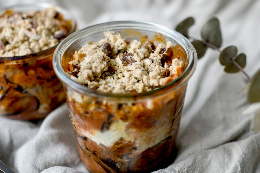 Aujourd’hui je vous propose une recette sortie tout droit de mes placards et qui nous a beaucoup plu. Un Crumble d’aubergines à faire cuire au four avec de la mozzarella et surtout des amandes. Le mélange est fondant et addictif, vous ne serez pas déçu.e.s !