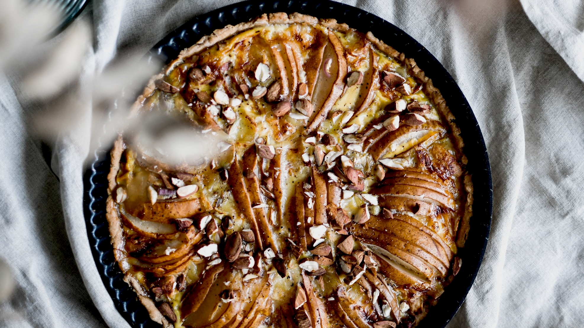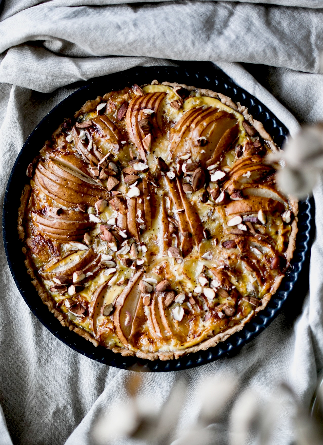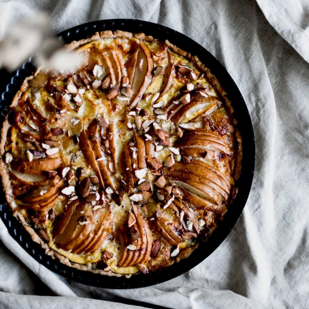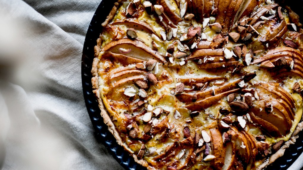 Tarte salée – échalotes, poires, gorgonzola et amandes
