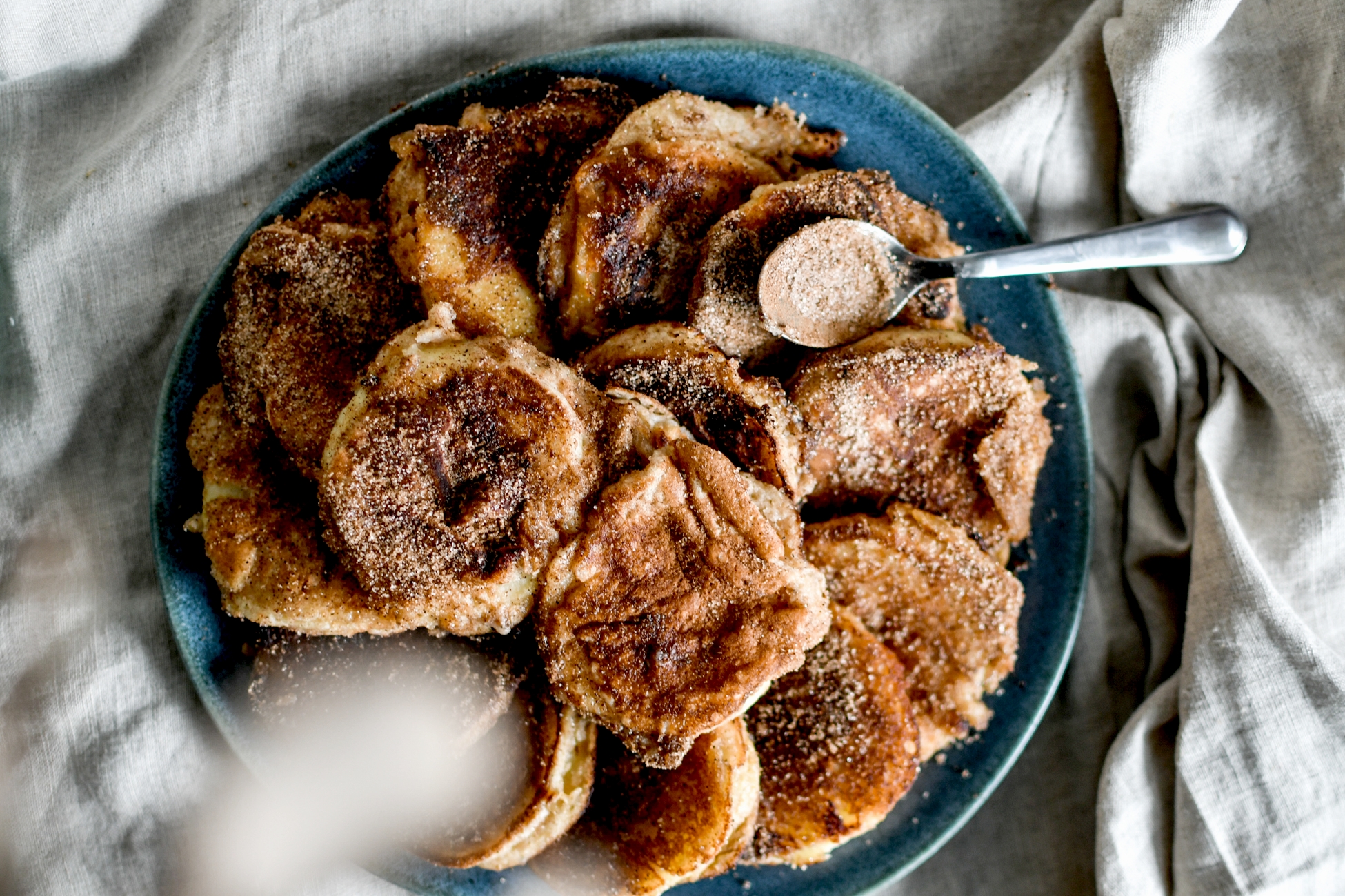 Mélanger le reste de sucre avec la cannelle et saupoudrer chaque face de beignet lorsqu’ils sont encore tièdes.