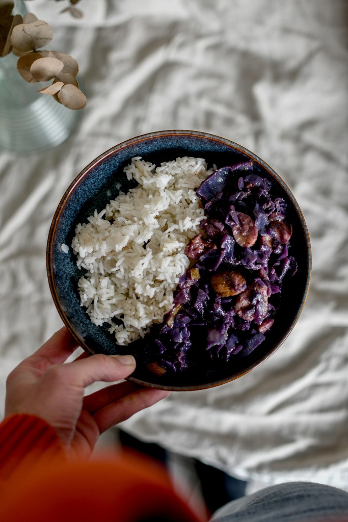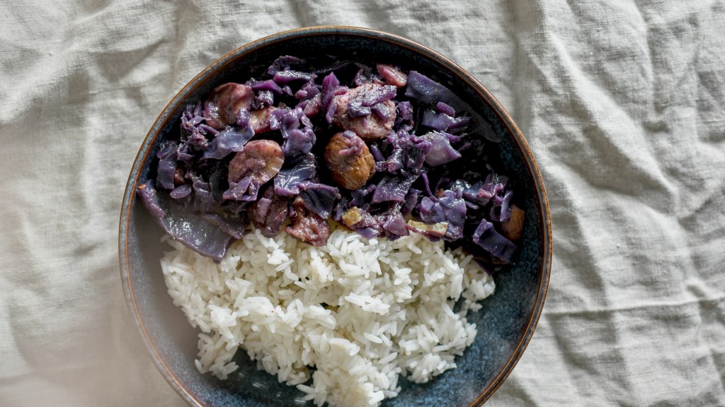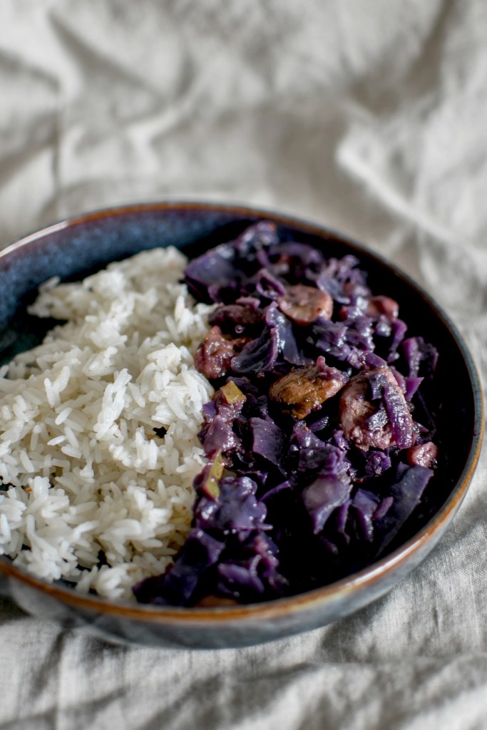 C’est un plat extrêmement facile à réaliser. Pour ma part je le sers avec du riz pour une version végétarienne qui lui rend toute sa noblesse en plaçant le chou au centre du repas. Il se suffit à lui même, le riz apportant simplement un peu de mâche et de douceur supplémentaire.