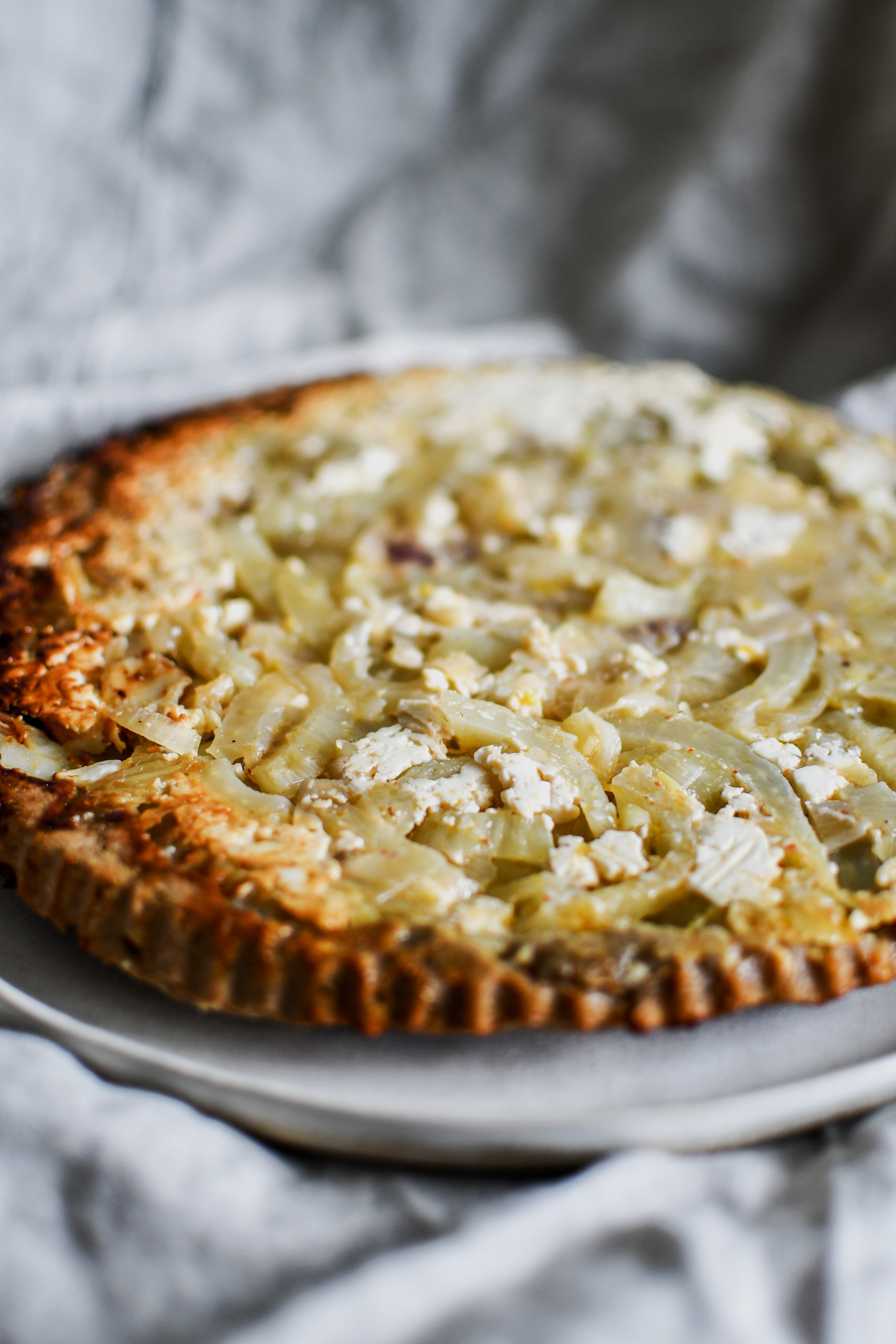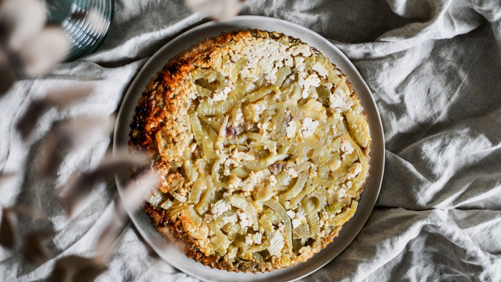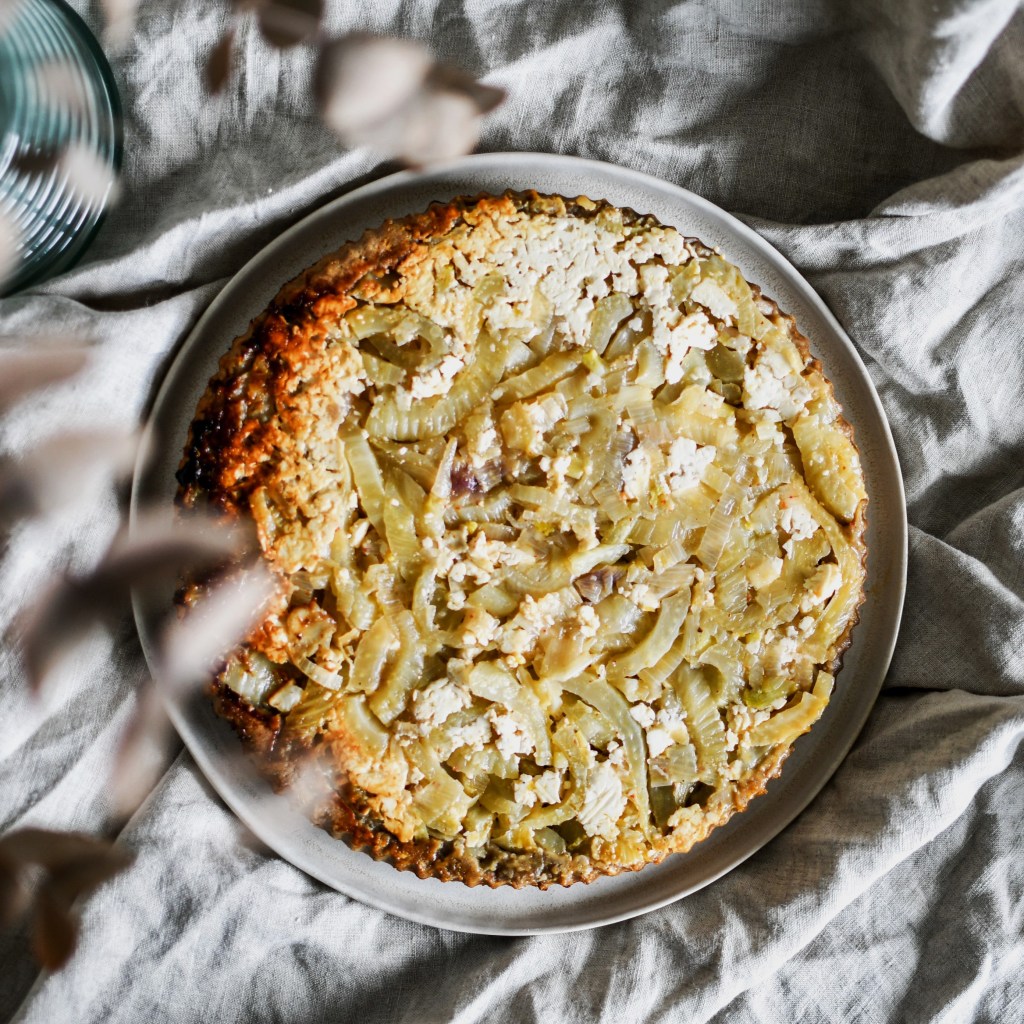 Déposer la feta au fond d’un moule à tarte préalablement graissé si besoin et recouvrir avec le fenouil cuit.