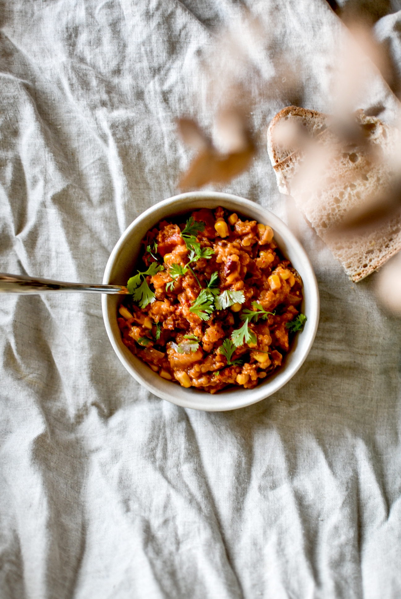 Préférez évidemment des ingrédients bio et de saison pour les légumes que l’on peut également remplacer ici à l’envie. En plein mois de juillet, j’ai privilégié les tomates et les carottes … mais on peut aussi y mettre des courgettes, des aubergines, de la patate douce ou n’importe quoi d’autre. Les poivrons restent toutefois indispensables pour le goût du chili (évitez donc de faire cette recette en hiver sauf si voys vivez en Australie).