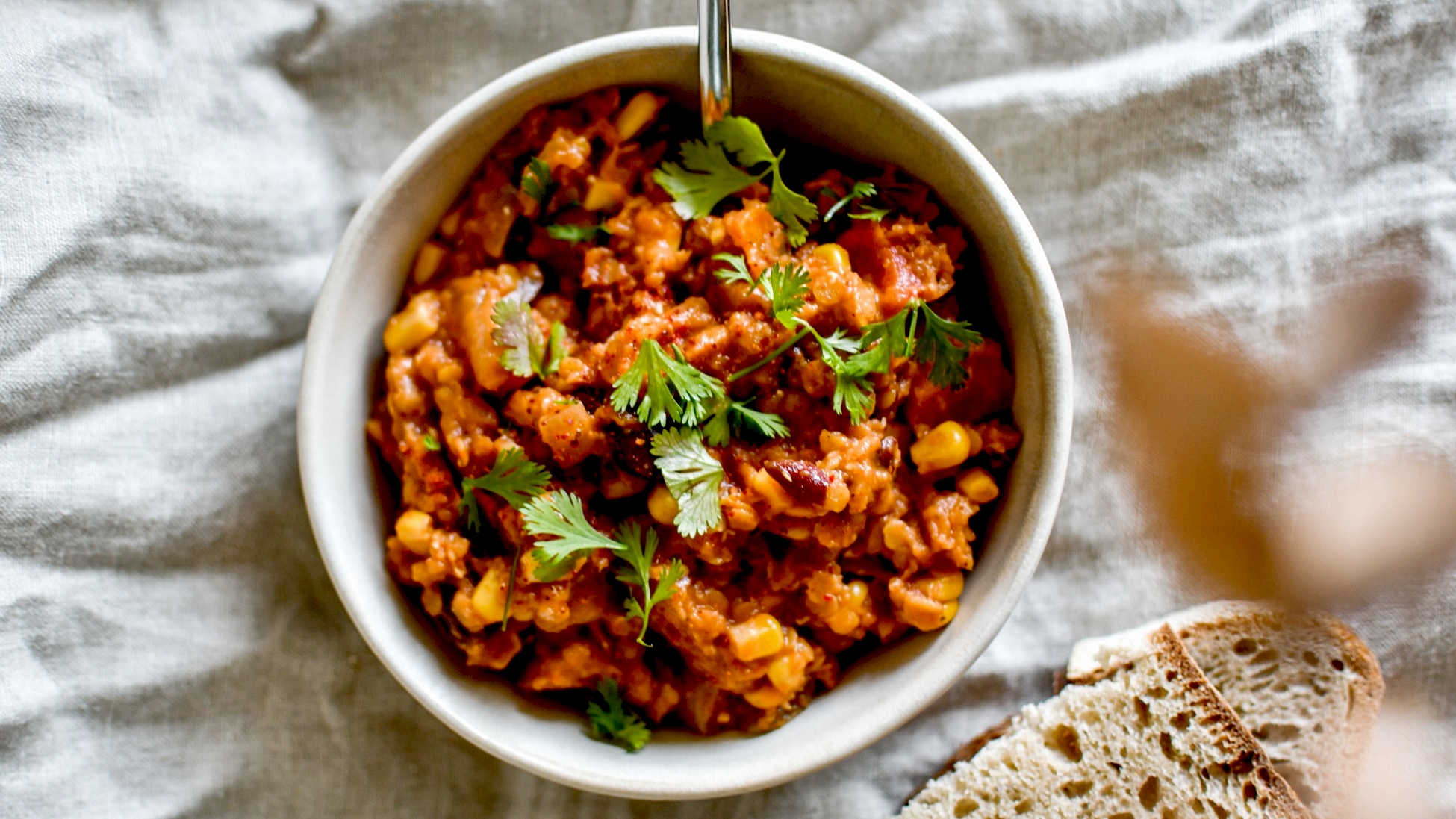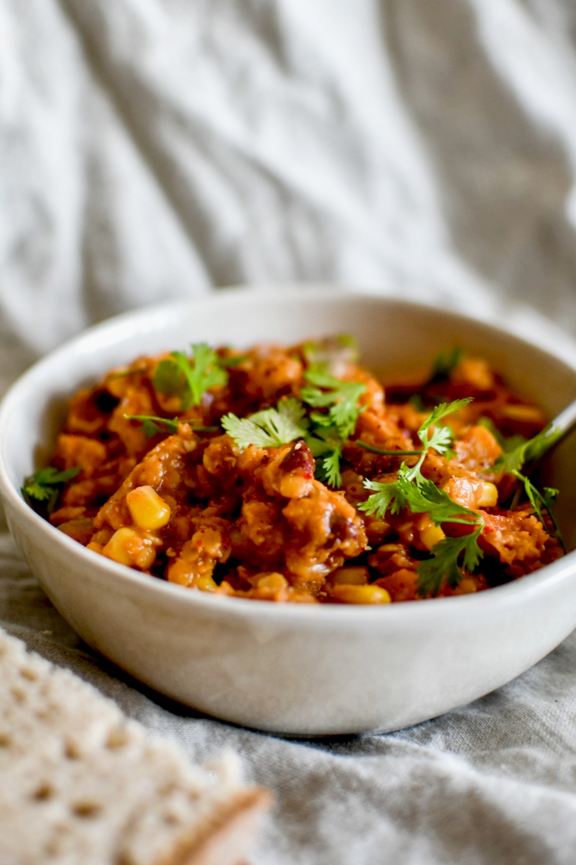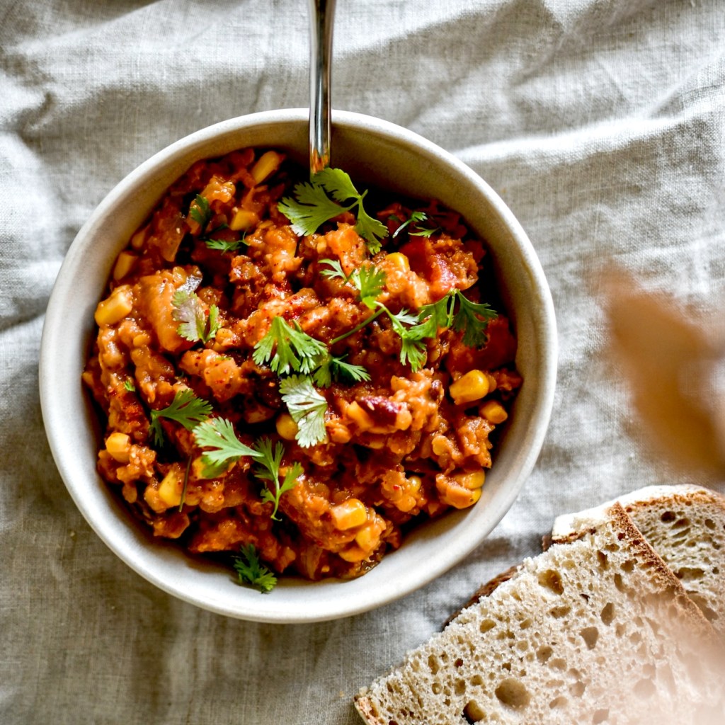 C’est un plat complet qui se suffît à lui même, riche en protéines et en fibres, on peut l’épicer et le pimenter à l’envie. J’aime quand ça pique fort mais il est possible de l’adoucir pour qu’il convienne à tout le monde (en ôtant le piment par exemple).