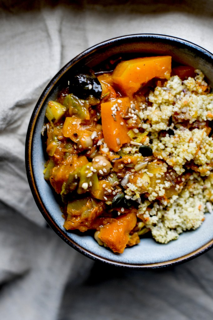 Cela étant posé, il faut quand même admettre que de cuisiner les mêmes légumes tout l’hiver peut s’avérer lassant. Heureusement, je suis là pour pimper vos assiettes et cette recette est absoulument divine. C’est un tajine de légumes à base de butternut, navets et poireaux qui peut se dévorer avec de la semoule ou juste du pain. Bref, un combo incroyable qui vous fera une belle base pour tous les repas de la semaine. Vous m’en direz des nouvelles.
