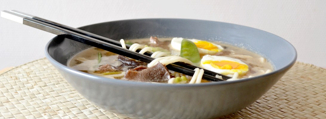 Il est temps de vous présenter un plat que j’ai découvert avec mes copines il y a très peu de temps : le Ramen ! C’est un bouillon japonais à base de nouilles, de viande, de légumes ou de poisson, assaisonné au soja et aux épices. Il constitue un plat tout à fait complet, très sain et qui plus est vraiment délicieux ! Je n’ai donc pas pu m’empêcher d’en réaliser un chez moi avec l’aide de mon cher est tendre qui était ravi de goûter enfin au plat préféré de Naruto (je ne le savais pas non plus, rassurez vous ! ^^). Lire la suite