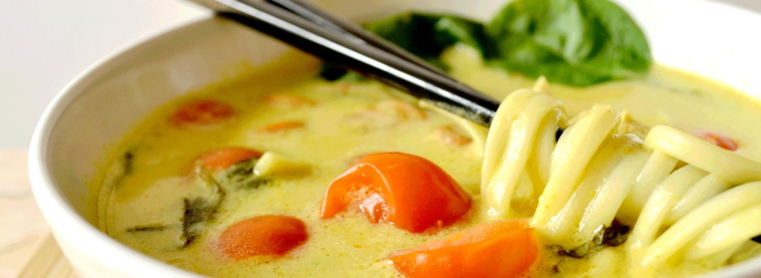 Avec une journée pluvieuse comme aujourd’hui, quoi de mieux qu’une bonne soupe pour se réchauffer ? Et qui plus est, une soupe pleine de chaleur et de saveurs ! Aujourd’hui j’ai en effet testé une nouvelle recette de bouillon thaï, le Khao Soy. Et vous savez à quel point j’aime ça ! Il s’agit d’une soupe de poulet et de légumes à base de curry jaune et de lait de coco. On la sert surtout dans le Nord de la Thaïlande et c’est aussi beau que sain ! Lire la suite